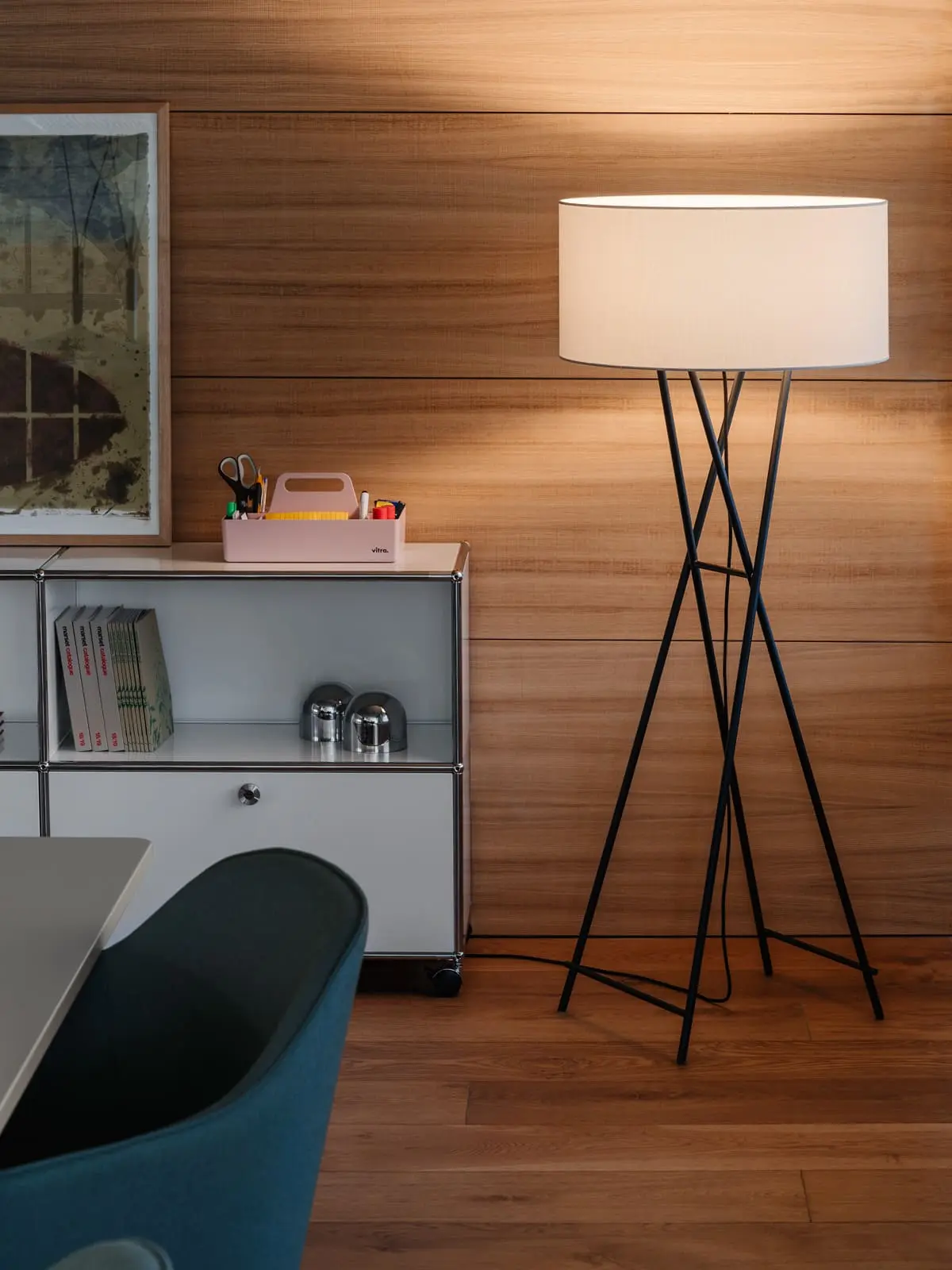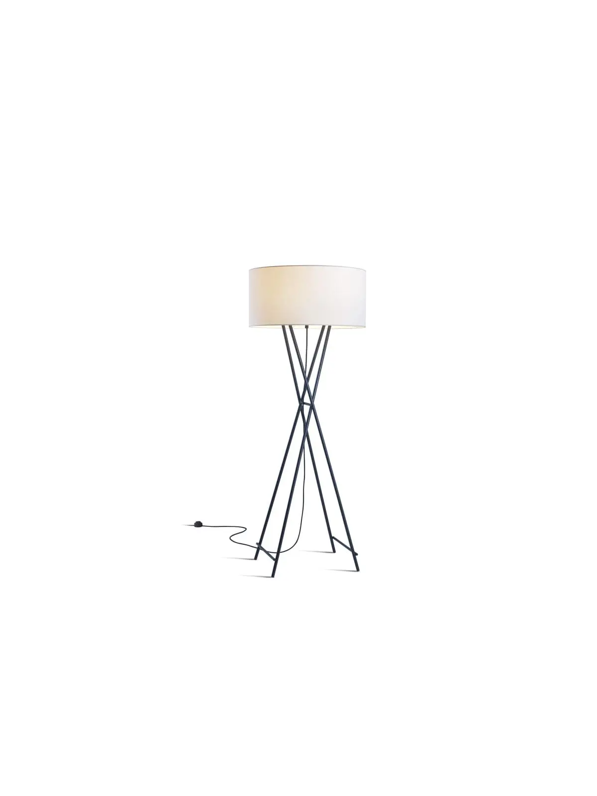 Stehleuchte Cala Metal ist eine frische Ergänzung des gleichnamigen Modells aus Holz. Die großzügige Leuchte kombiniert Holz und Stoff sowie Schwarz und Weiß. Dadurch wirkt die Marset Stehlampe modern und luftig.