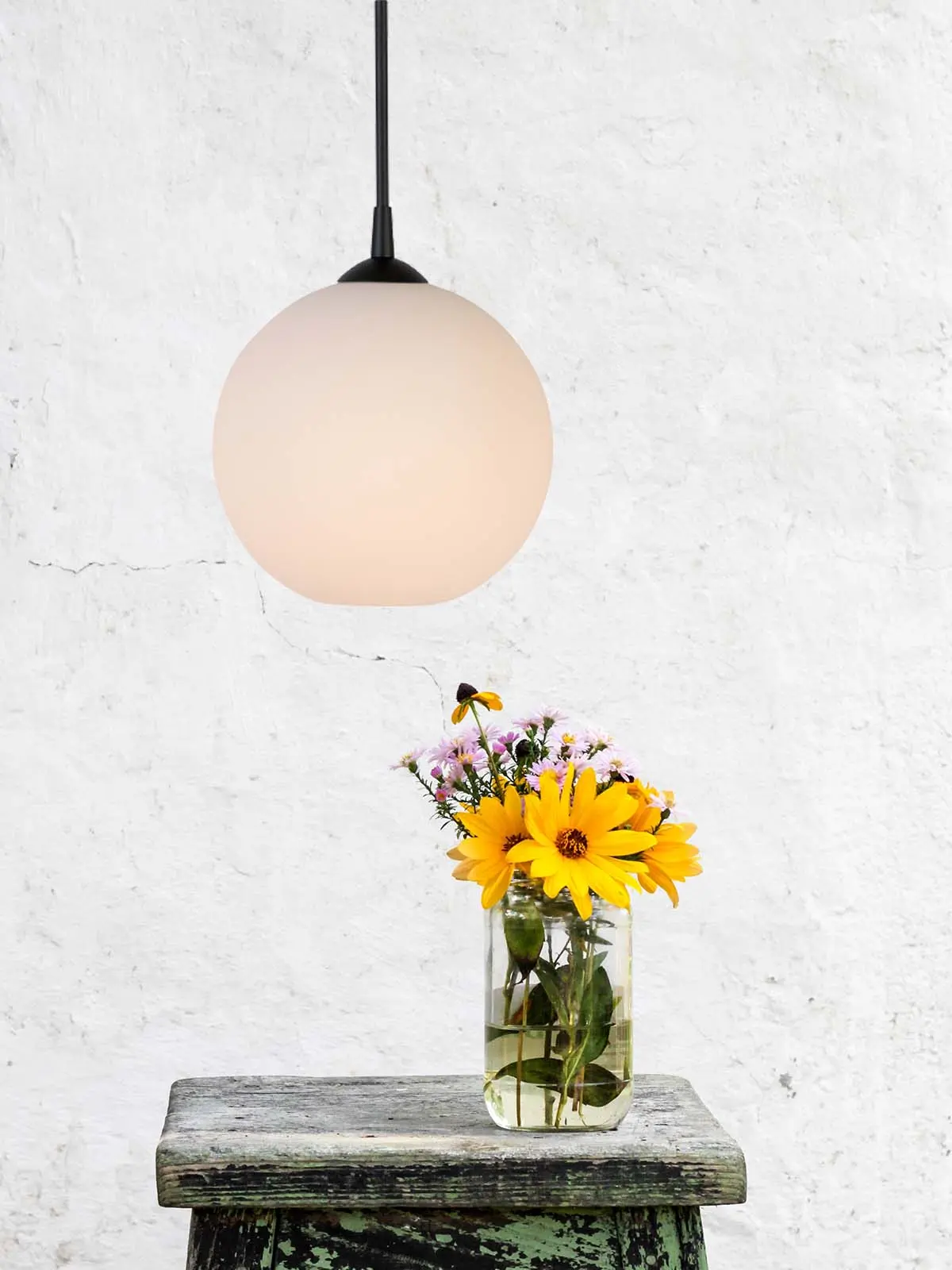 Der Capo Lampenschirm aus Milchglas ist an der Unterseite leicht geöffnet. Dadurch fällt etwas mehr Licht direkte nach unten ab. Opalglas hat die Eigenschaft, das Licht zu allen Seiten zu streuen, ohne dass es dabei blendet. Eine halbrunde Aufhängung in Schwarz sowie ein gleichfarbiger Rundstab bilden dann gekonnt den Übergang zum Kabel.