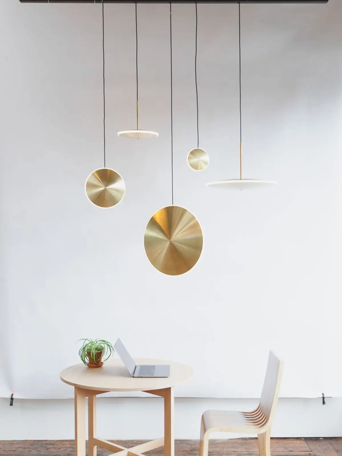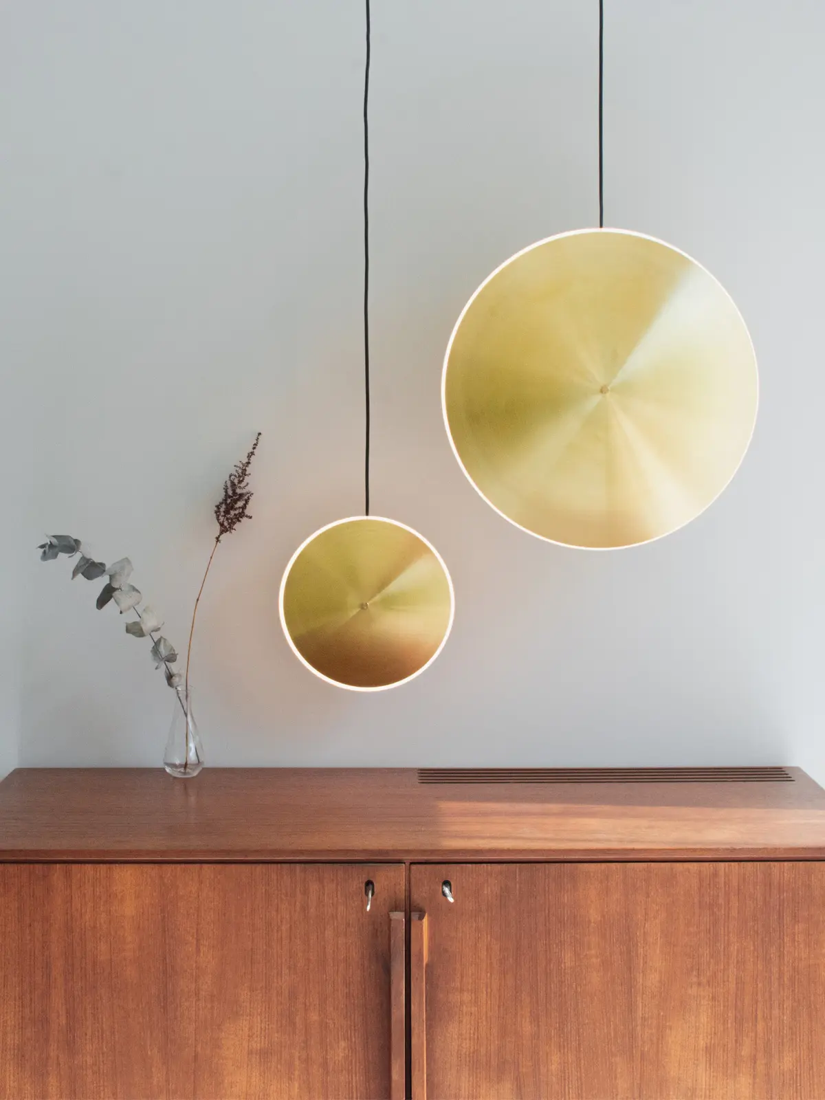 Die Designer von Graypants ließen sich von der Schönheit vor ihren eigenen Augen und der Schönheit der Sterne inspirieren. So ahmen die Chronalights eben das Strahlen von gasförmigen Himmelskörpern nach. Aus gedrehten Messingscheiben dring Licht durch einen Acryldiffuser und erzeugt leuchtendes Glühen. Dabei ist die Mitte der Scheiben nach oben und unten gewölbt, als würde die Schwerkraft auf sie einwirken. An der Oberseite in der Mitte verbindet ein Rundstab den Lampenschirm mit dem schwarzen Textilkabel.