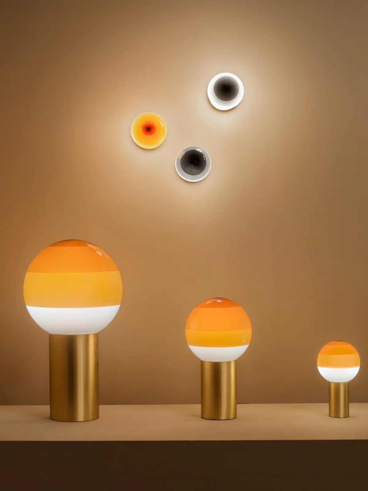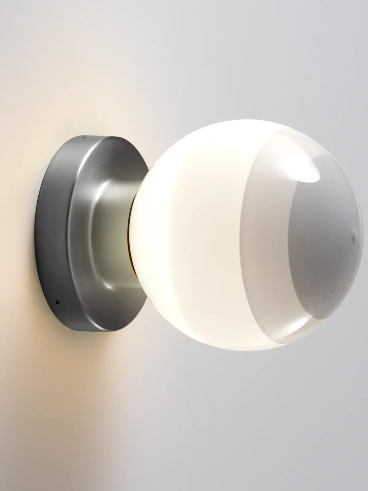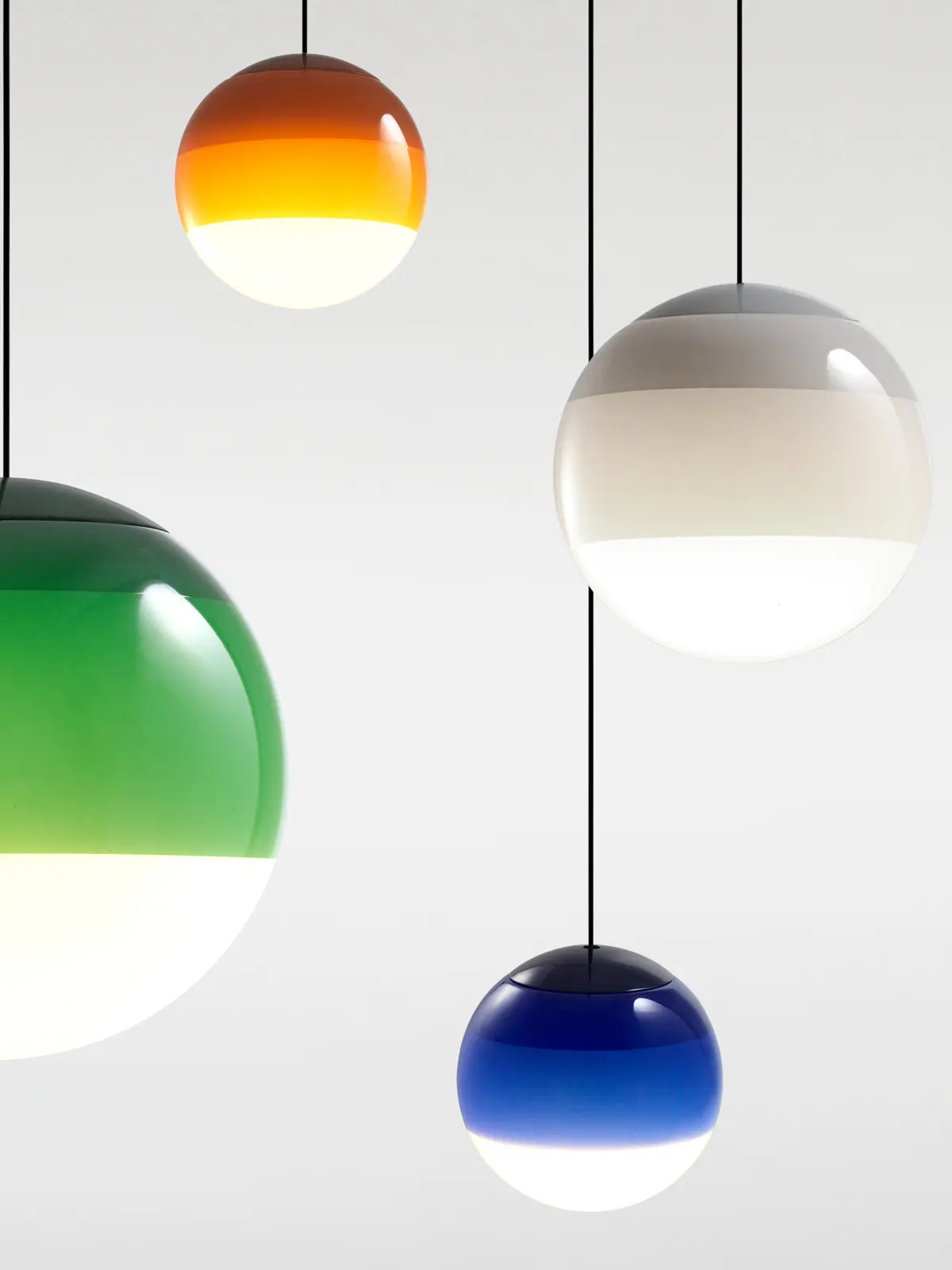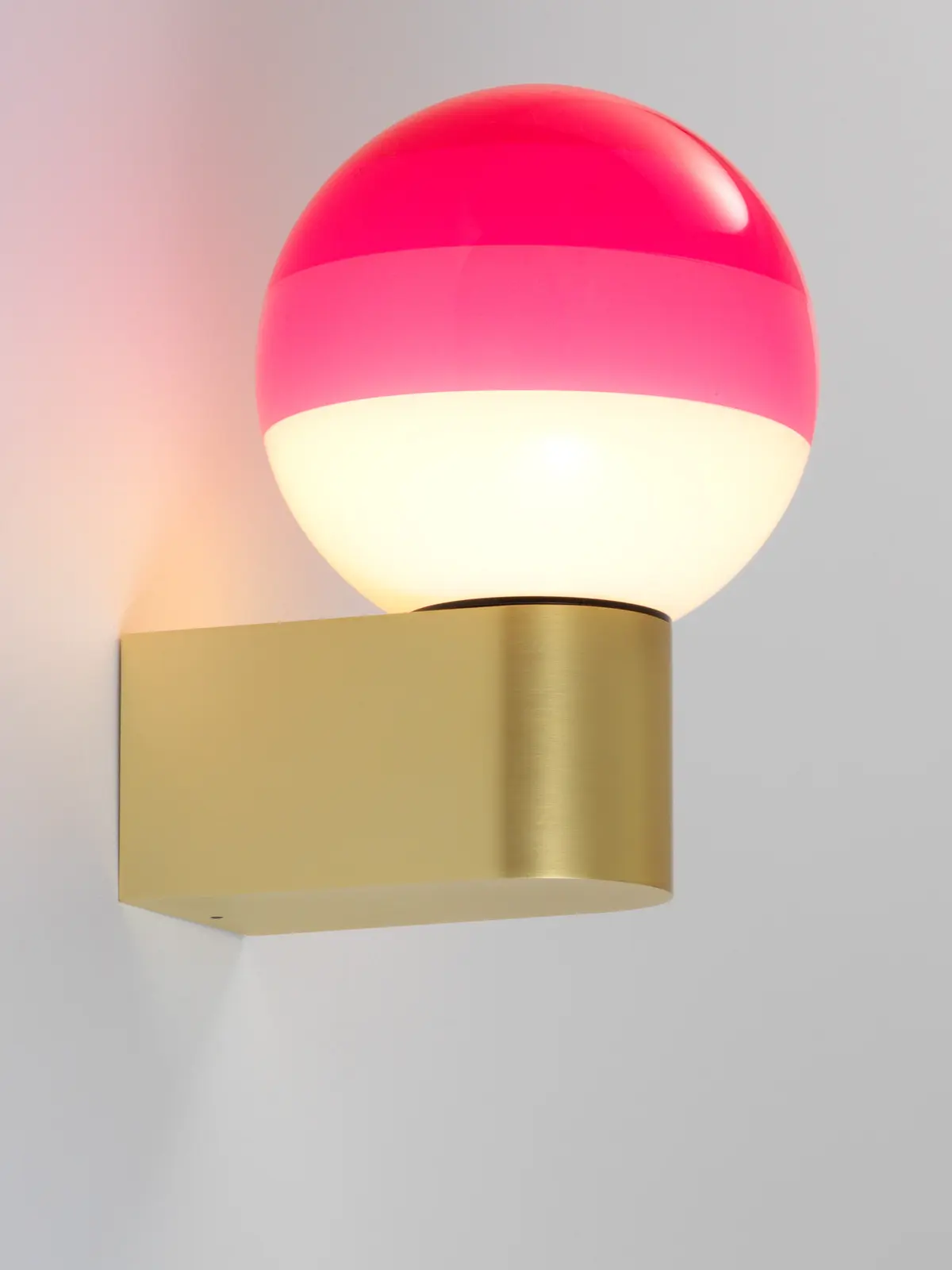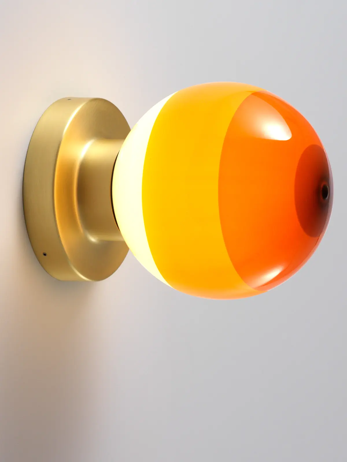 Die Wandleuchten Dipping Light A komplementieren die große Lampenfamilie von Marset. Grundlage für diese Serie ist ein kugeliger Lampenschirm aus mundgeblasenem Glas, der mehrmals in Farbe getaucht wird. Dadurch entstehen schöne Abstufungen einer Farbe. Da die Kugel unter den Ringen aus Farbe Weiß ist, blendet das Licht nie.