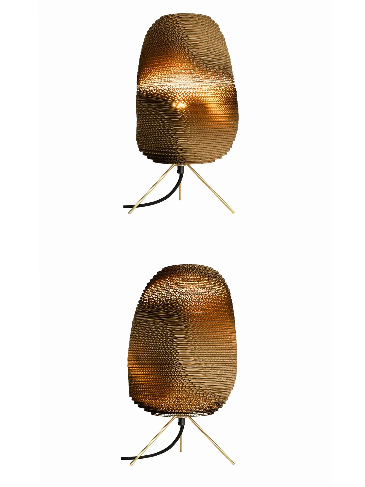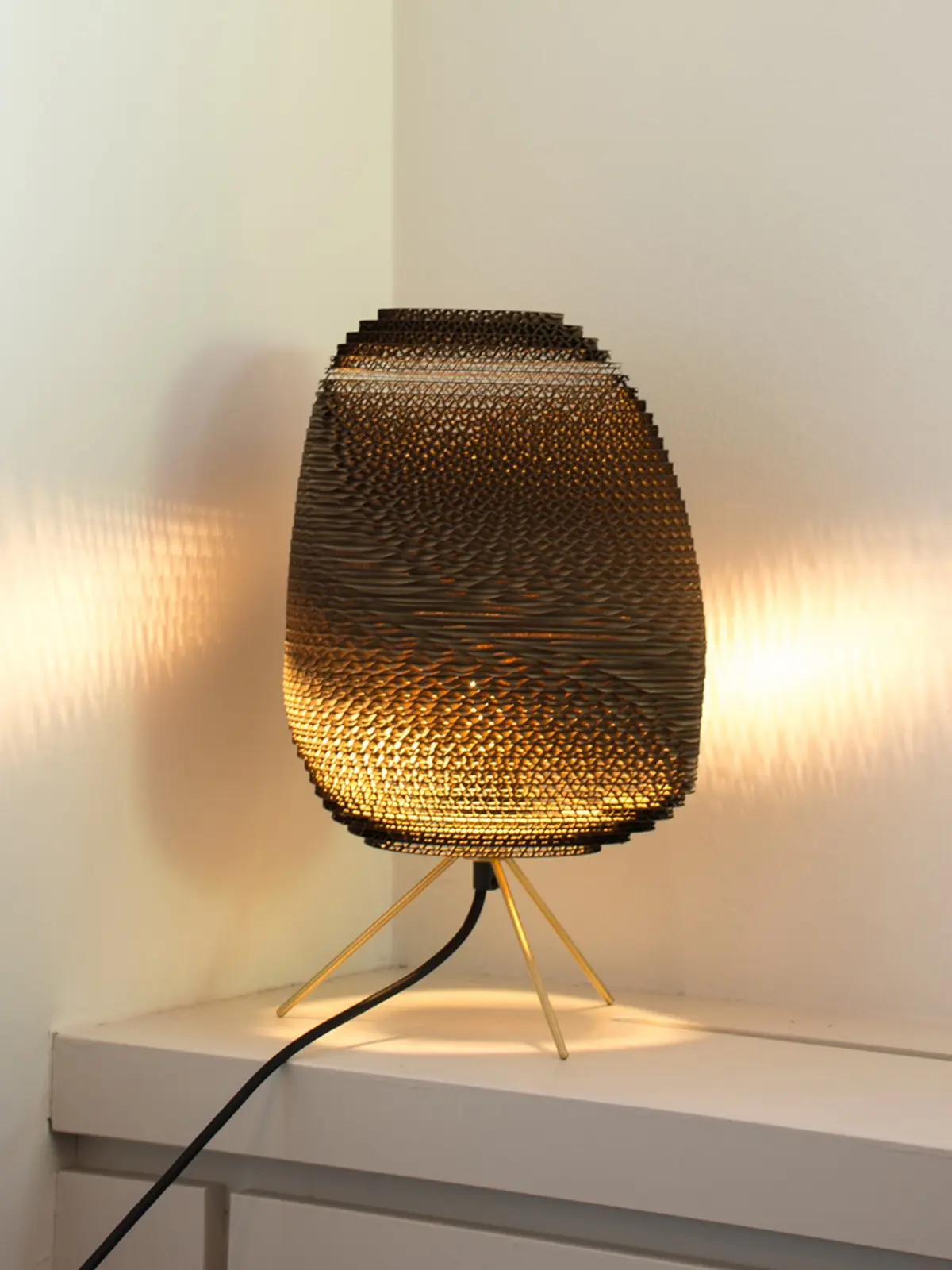 Bei Graypants Ebey Table Natur gleicht keine Seite der anderen. Denn die Wellpappe bildet eine Form wie etwa bei Kieselsteinen. An der oberen und unteren Seite ist der Schirm leicht geöffnet. Daher dringt etwas gerichtetes Licht nach oben und unten. Aus den Zwischenräumen des dunklen Materials dringt gedämpftes Licht. Dadurch entsteht eine äußerst dynamische Oberfläche. Zudem erzeugt der Schirm fast mystische Effekte von Licht und Schatten.