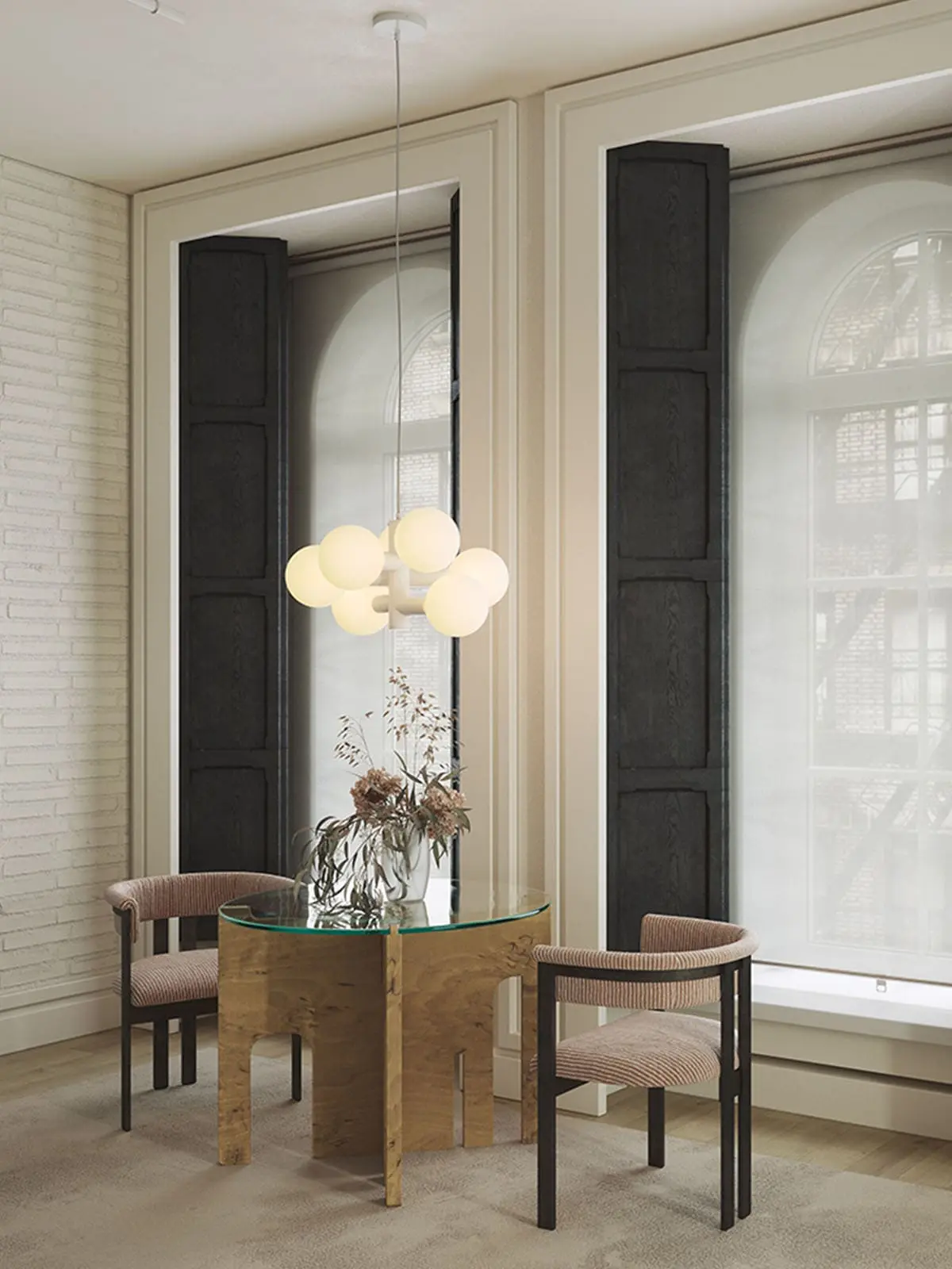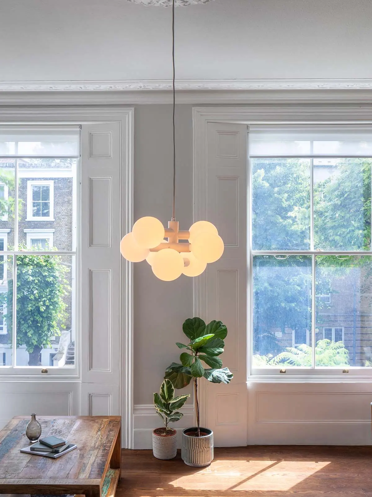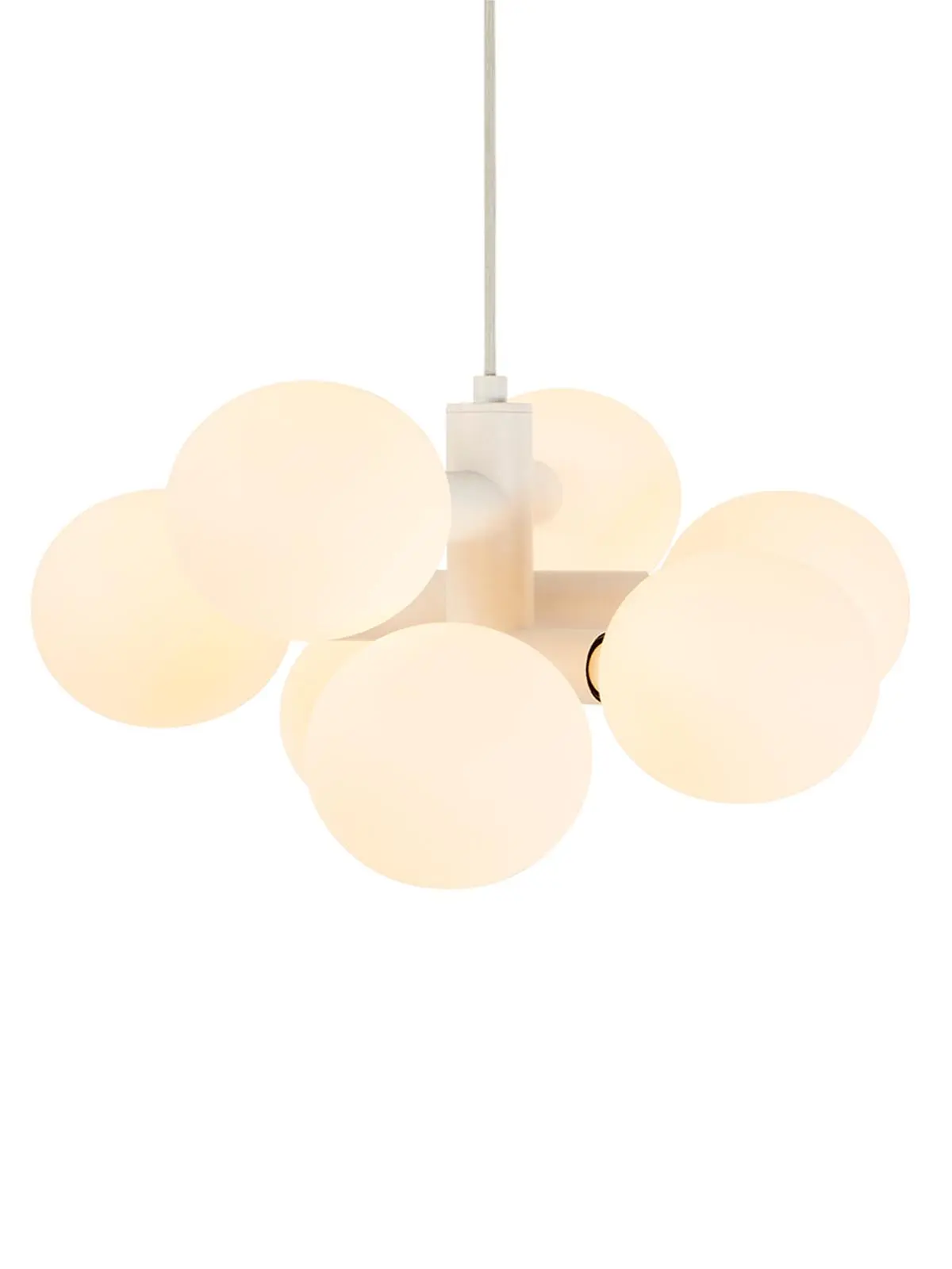 Das Design für Tala UK stammt vom Designer David Weeks. Ein Zylinder aus Stahl bildet zunächst das Grundgerüst des Echo Chandelier. Im 90 Grad Winkel sind dann weitere Zylinder eingeschoben, die an den Enden große Leuchtmittel tragen. Die runden Tala Birnen der Sphere Serie sind weiß, wodurch sie blendfreies Licht zu allen Seiten des Raumes verteilen. Die mundgeblasenen Birnen sind zudem dimmbar und flackern nicht.