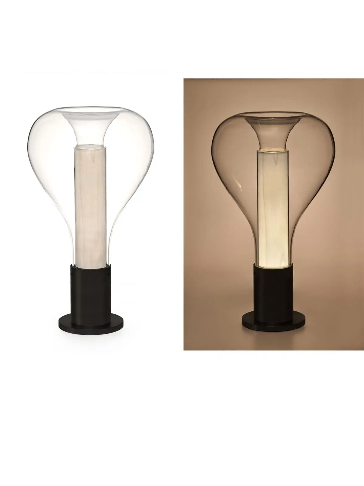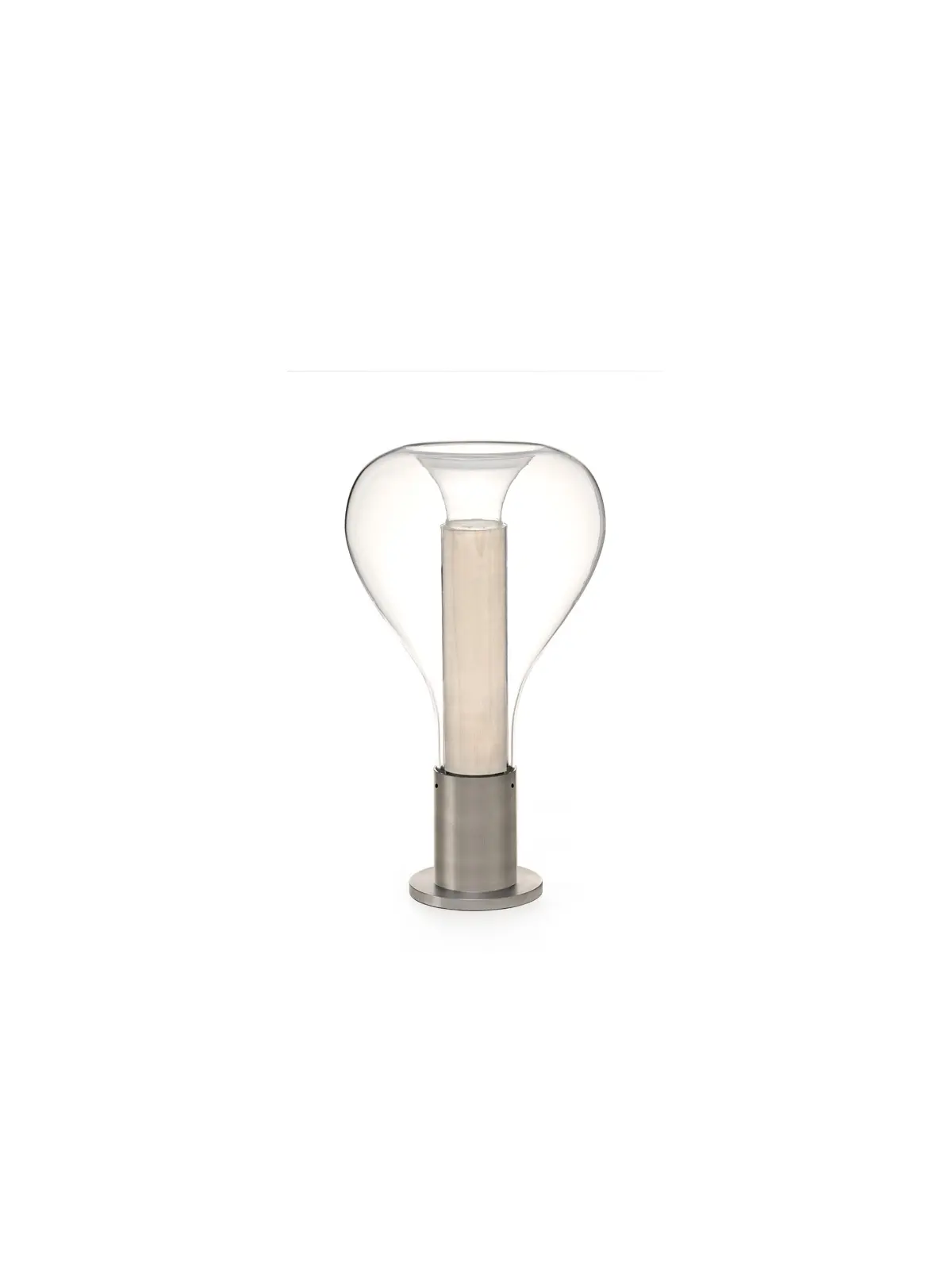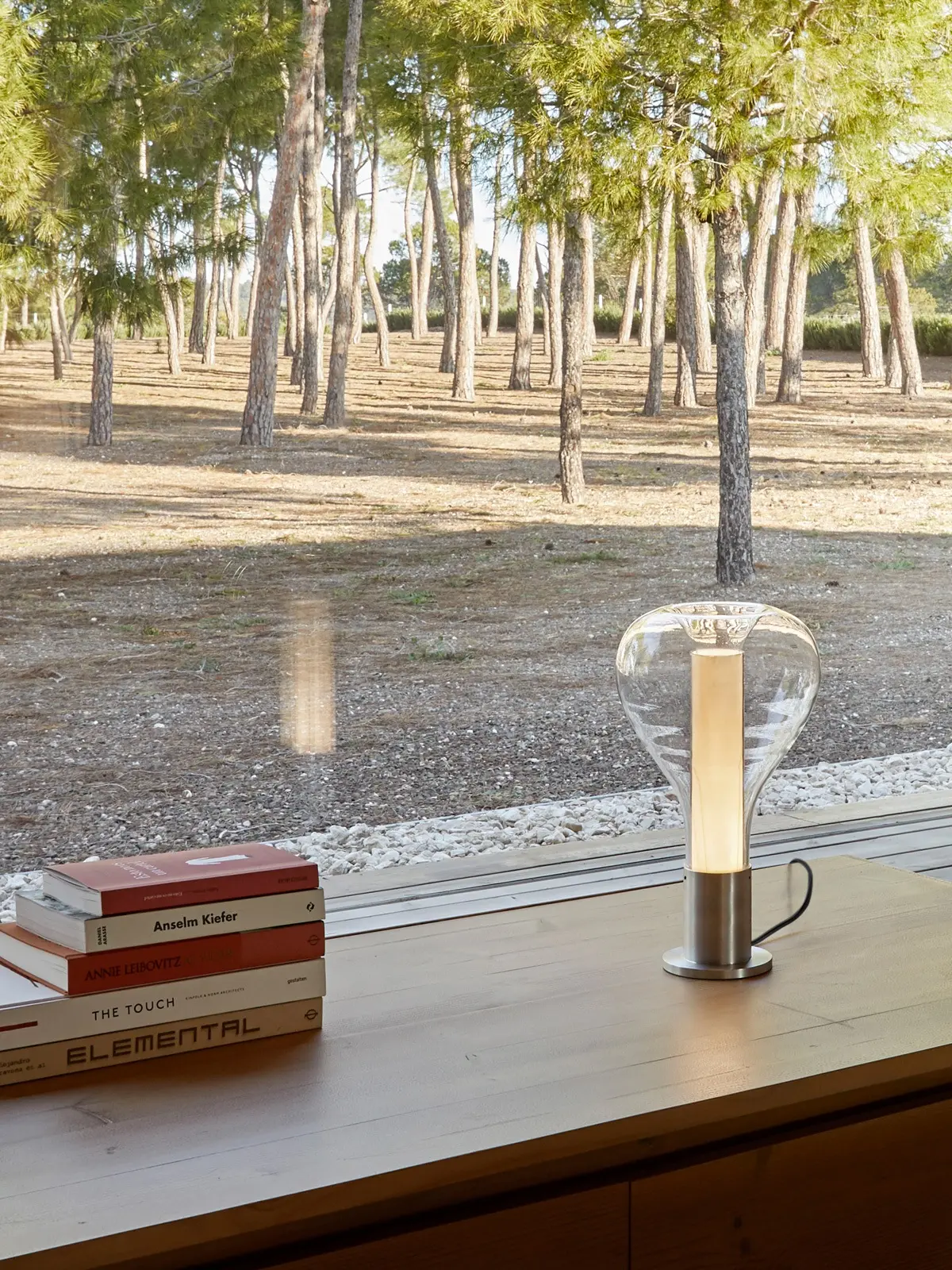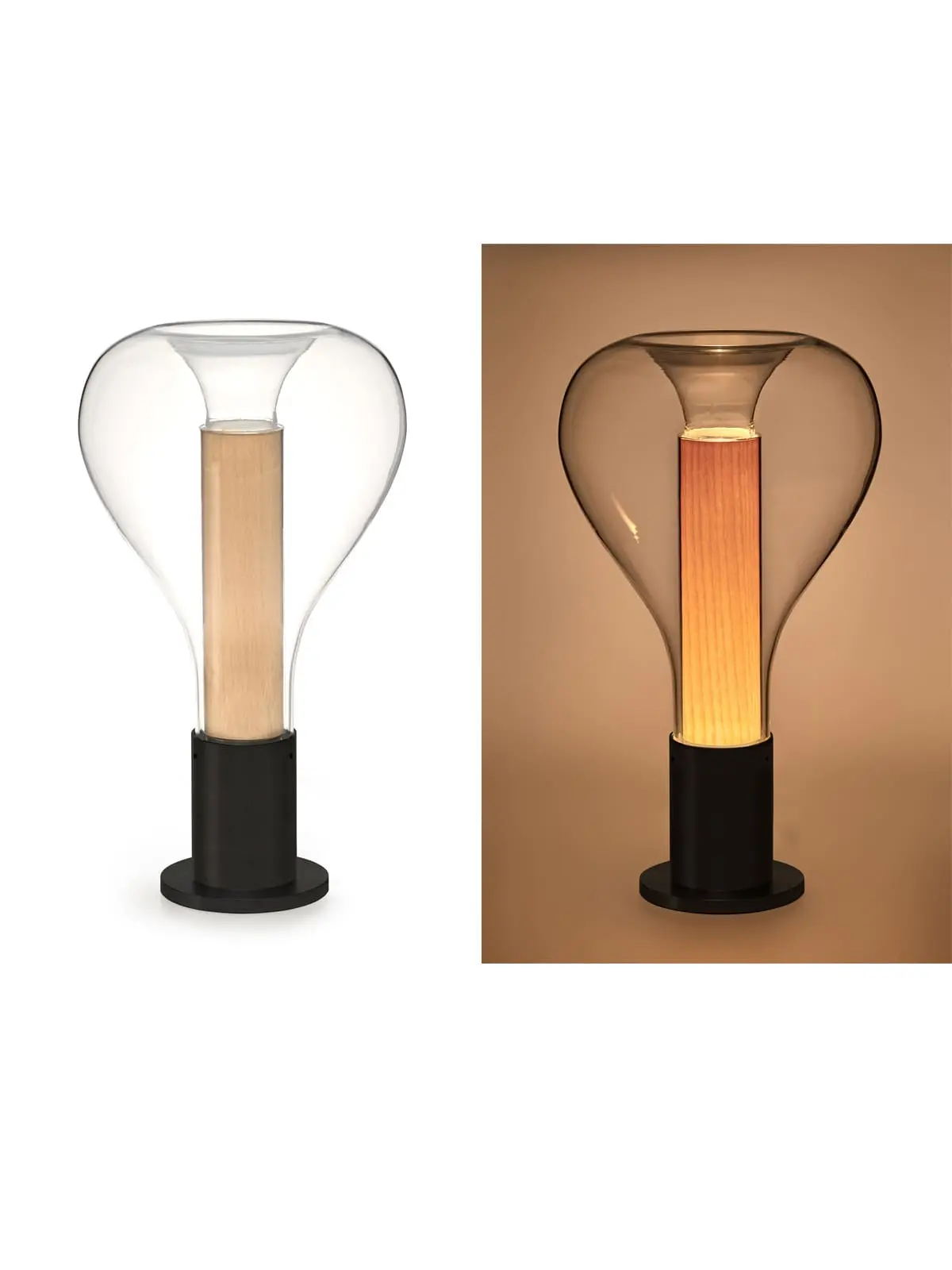 Das Studio Mayice aus Madrid fand die Inspiration für die Designs für LZF in den Sternen. Das Design der Tischlampe ähnelt dabei der Hängelampe, stellt es aber auf den Kopf. Der Lampenfuß aus Aluminium besteht aus zwei gleichfarbigen Elementen. Ein gerader Zylinder trägt Leuchte und Leuchtmittel und eine runde Scheibe unter der Basis sorgt für einen ordentlichen Stand. Nach oben reckt sich ein gerader Zylinder aus feinem Holzfurnier. Dieser dient ebenfalls als Diffusor. So bleibt das Leuchtmittel verdeckt und das Licht blendet nie. Umschlossen wird diese Konstruktion von einem Tropfen aus mundgeblasenem Glas. Am oberen Abschluss fällt dieser Tropfen wieder ab und geht eine Verbindung mit dem Holz ein.