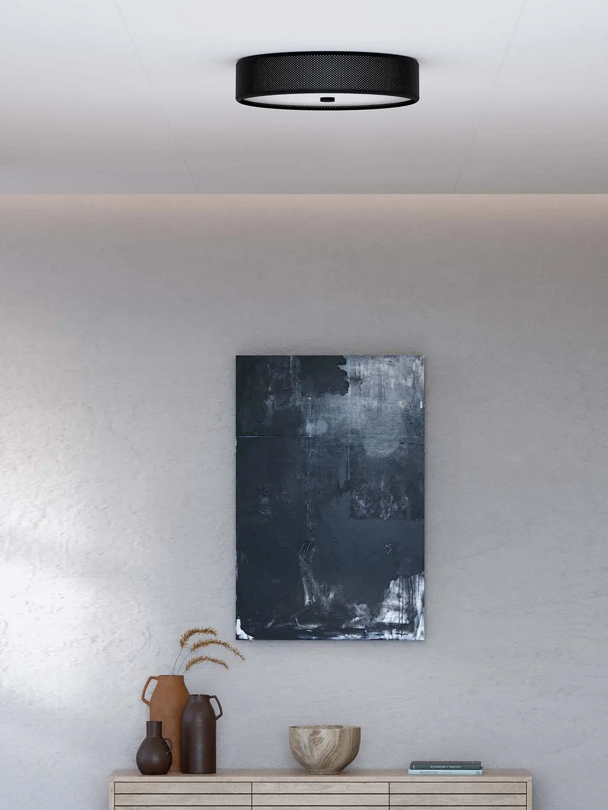 Die große Deckenleuchte Grain Ceiling rundet die Grain Leuchtenkollektion von Herstal ab. Mit einem Durchmesser von 50 Zentimetern eignet sie sich als primäre Lichtquelle in Fluren oder Räumen mit niedriger Deckenhöhe. Das zeitlose Design in Schwarz-Weiß fügt sich dabei in unterschiedlichste Umgebungen ein.