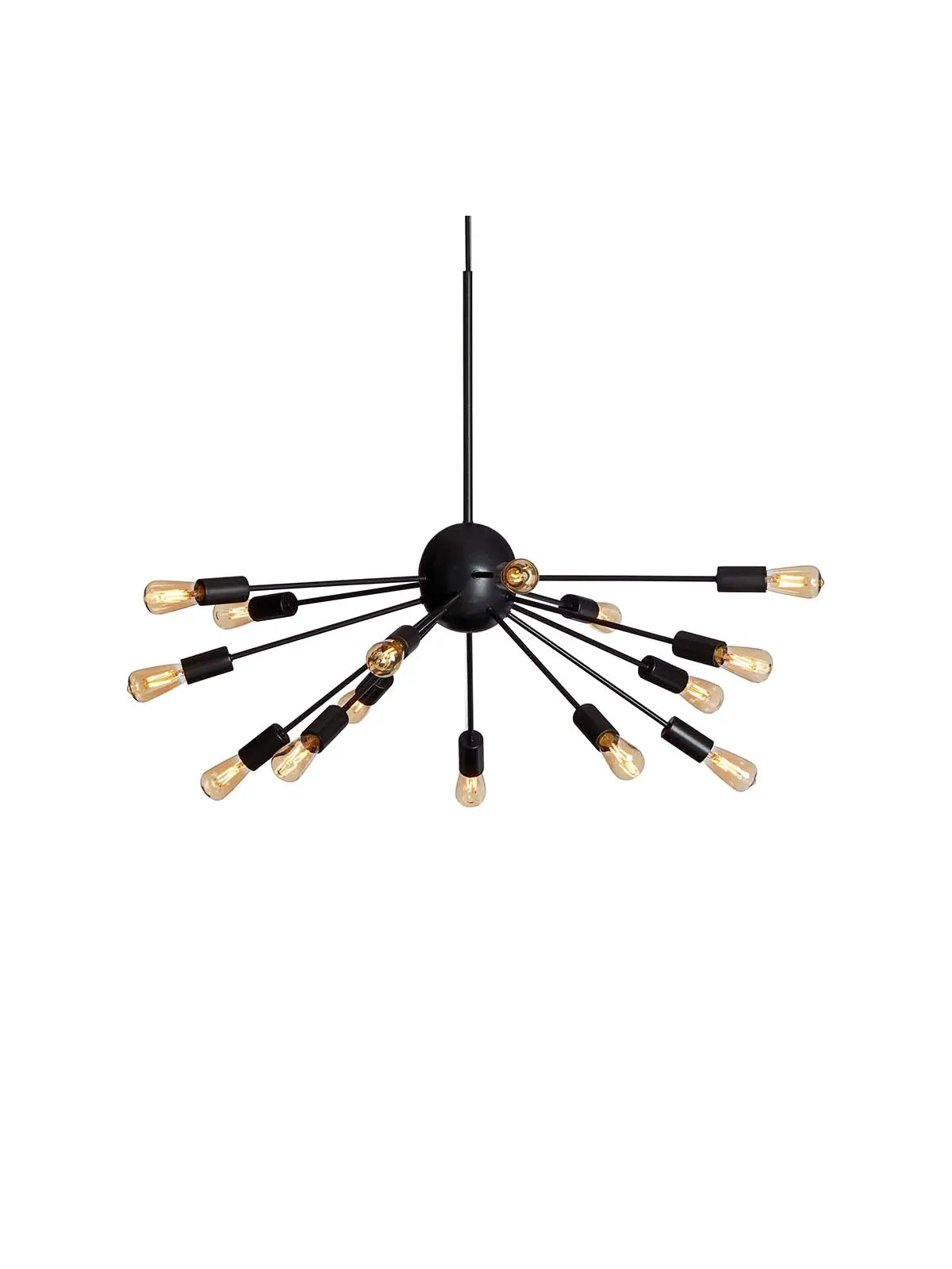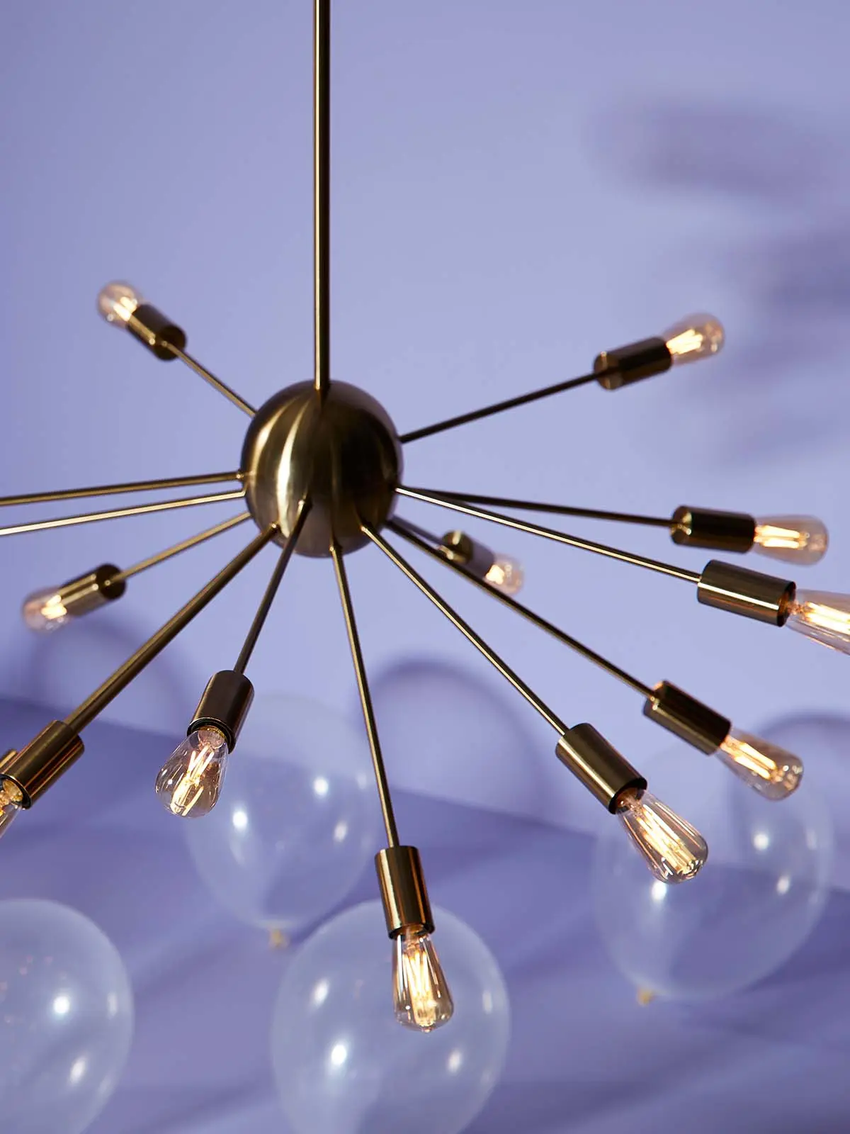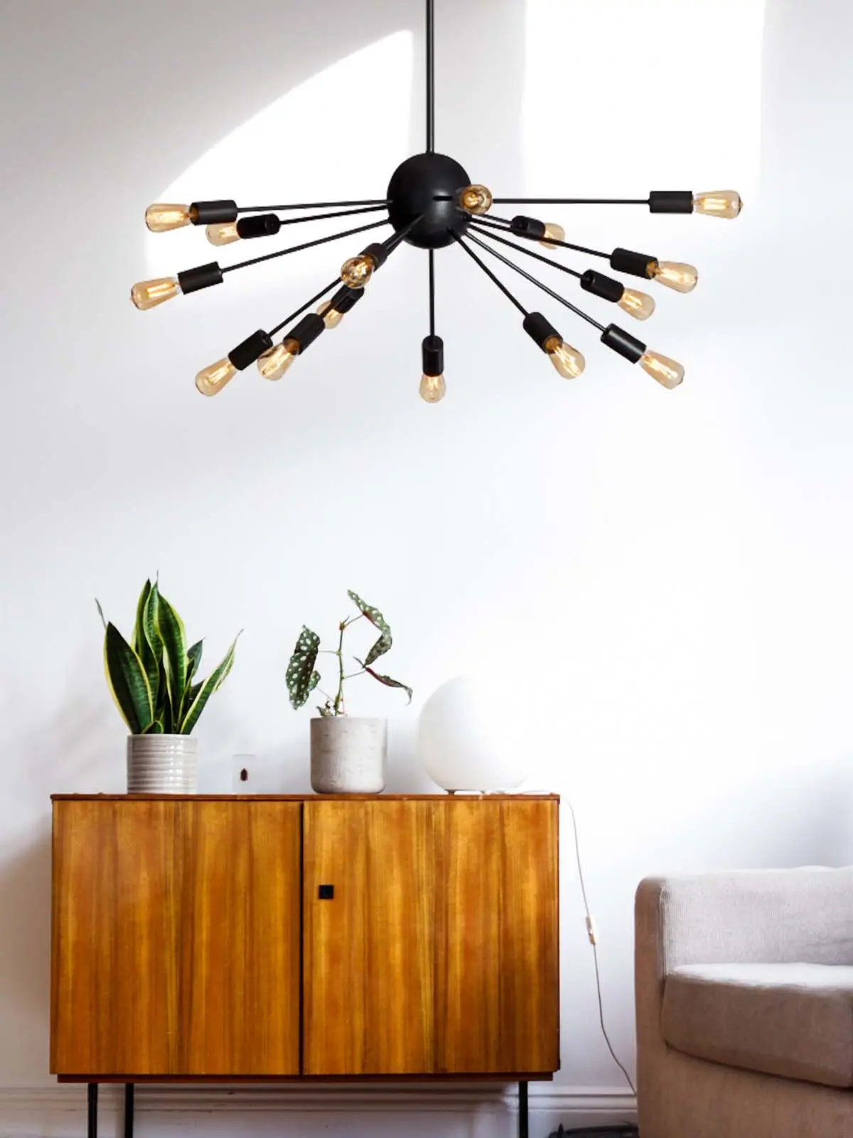 Die ausladende Hängelampe eignet sich ideal als Raumlicht für Wohnzimmer, Arbeitszimmer oder auch die Gastronomie. Zudem macht MIR in Eingangsbereichen oder Räumen mit hohen Decken eine hervorragende Figur. Von der Kugel im Zentrum gehen 15 Lampenarme ab, die dann E14 Leuchtmittel im Vintage-Look tragen. Als elegante Überleitung zum Kabel dient ein schmaler Rundstab. Dieses Design passt zu Boho-Einrichtungen genauso wie ins moderne Loft. Kombiniert die mehrflammige Designerleuchte mit alten Möbeln oder setzt sie gekonnt als Stilbruch in Szene.
