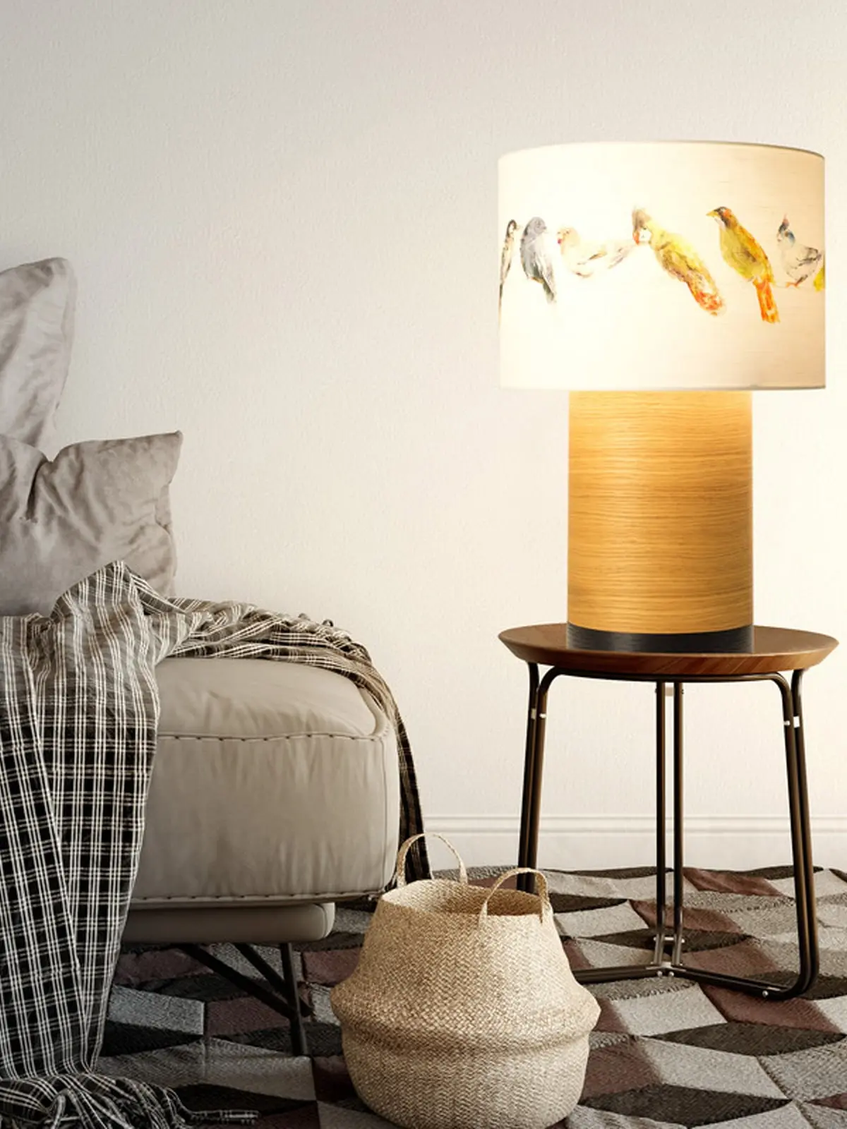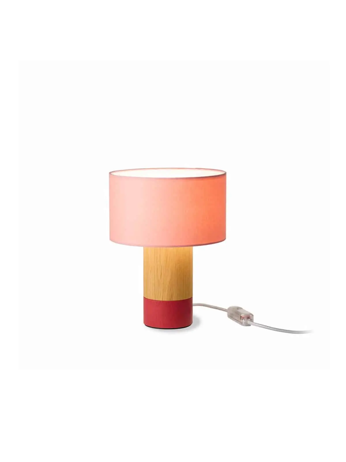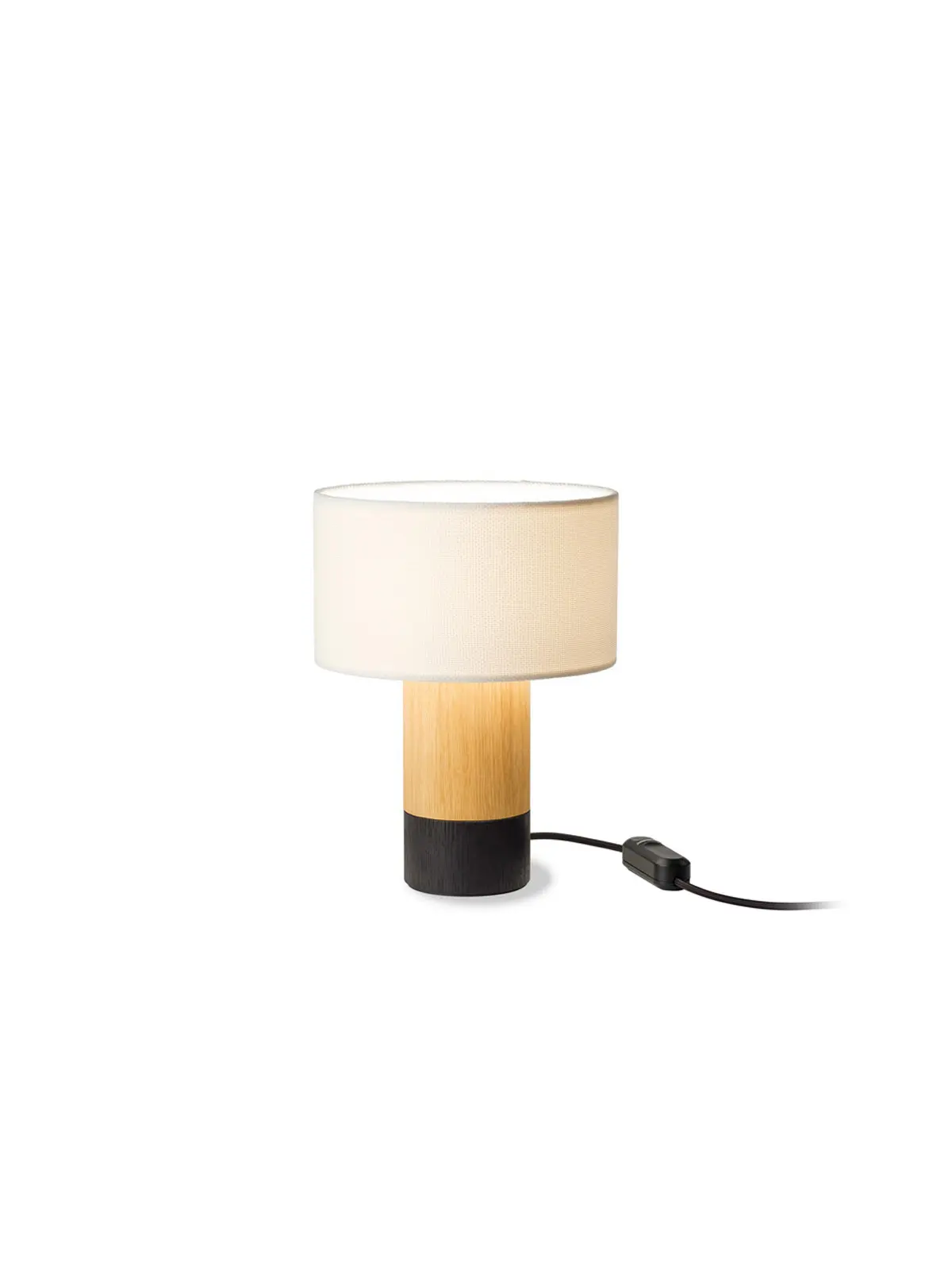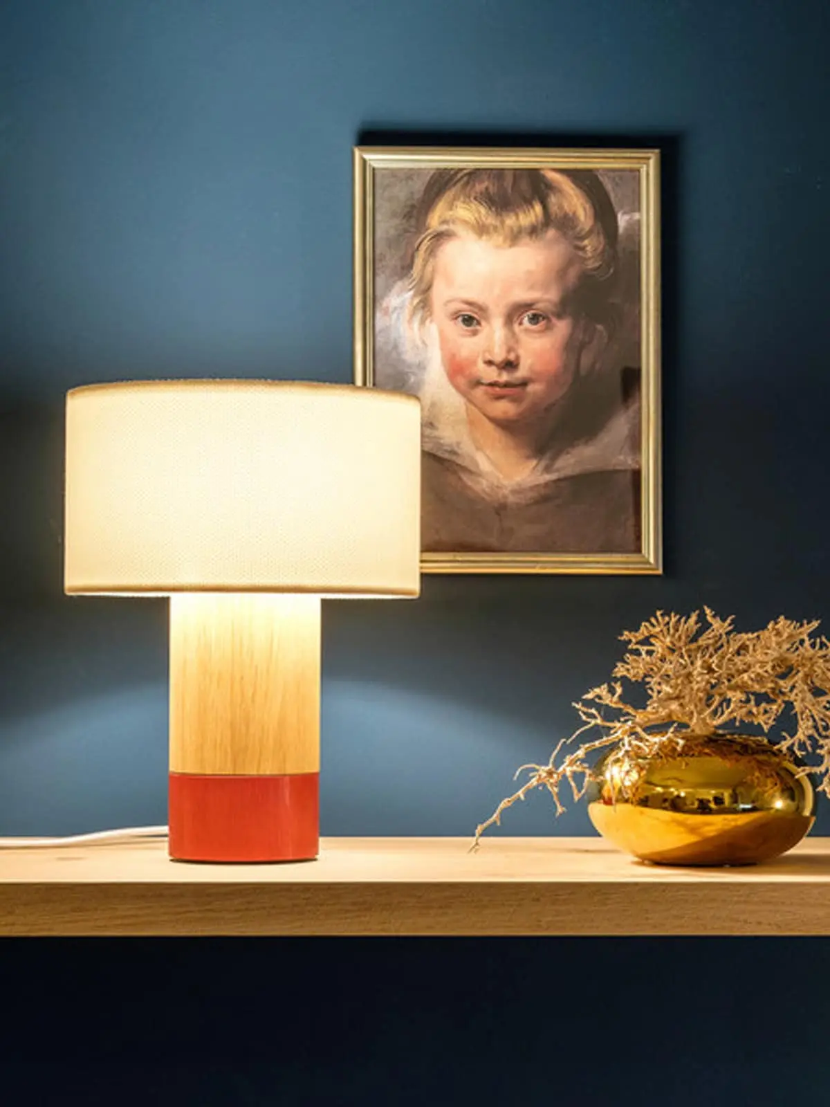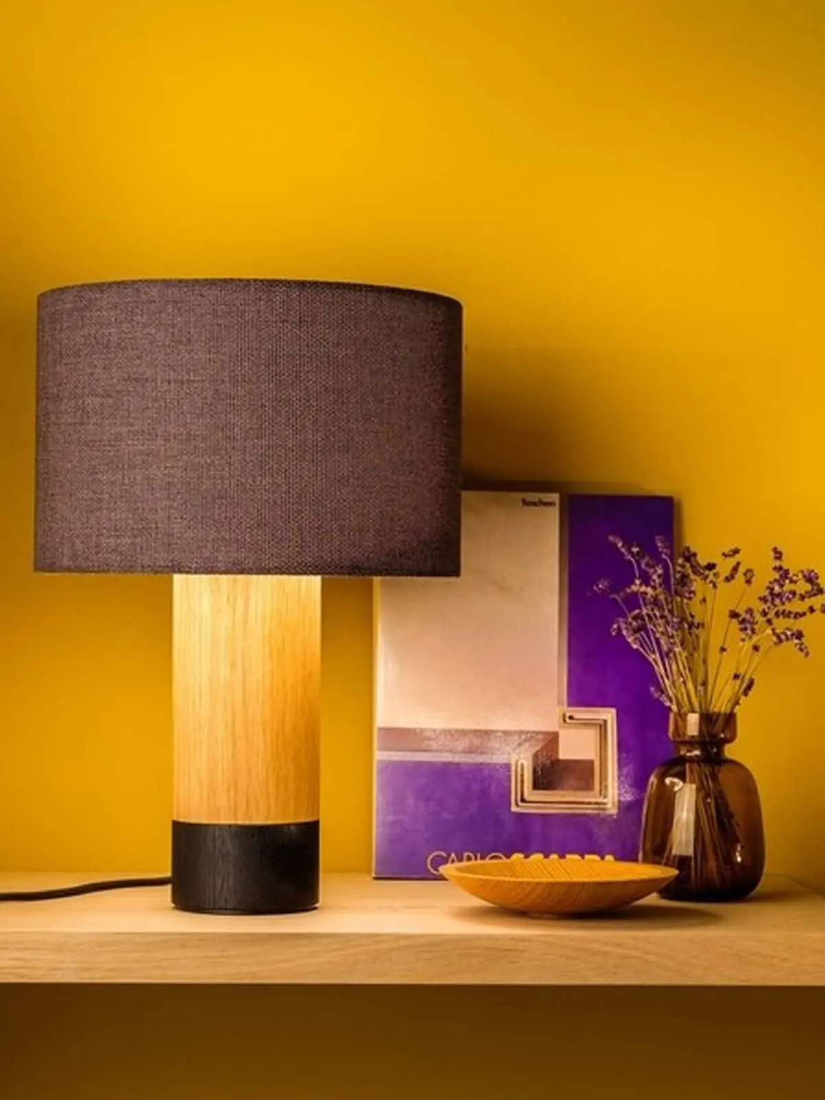 Die Serie von Tischleuchten namens Klippa beeindruckt mit dem Zusammenspiel unterschiedlicher Farben, Formen und Materialien. Für diese nachhaltige Holzleuchte mit Textilschirm von Domus Licht kann man aus mehreren Farben wählen.