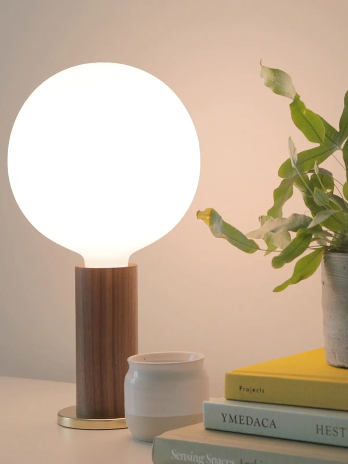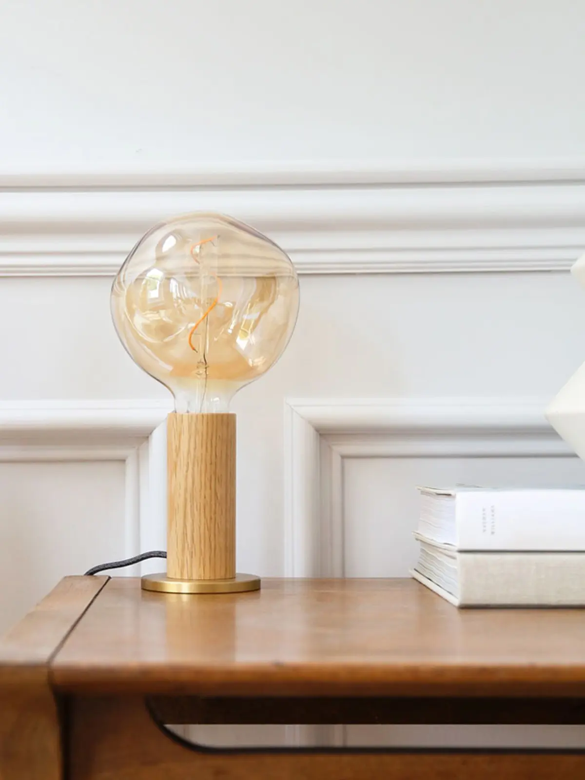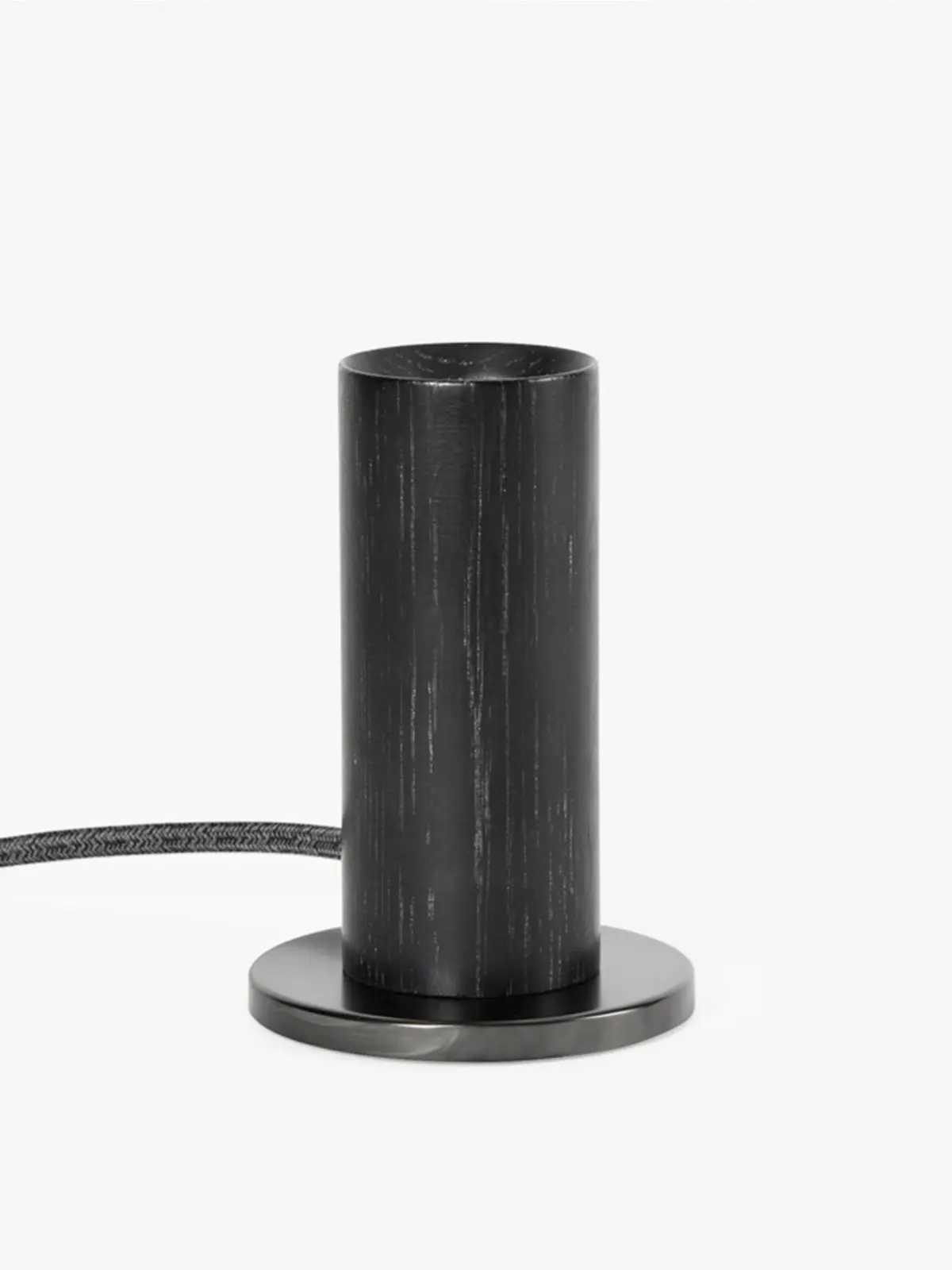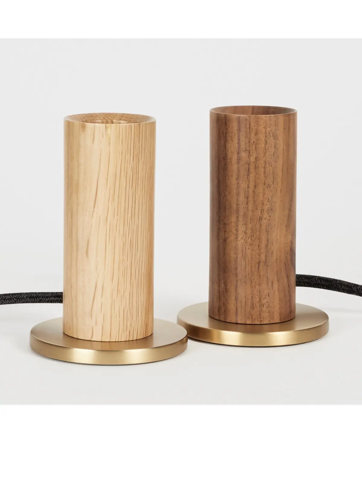 Basis dieses minimalen Designs ist zunächst FSC-zertifiziertes Holz. Hierfür kann man zwischen heller Eiche und dunkler Walnuss wählen. Der schlanke, handgedrehte Zylinder sitzt auf einer Platte aus Messing. Dieser kleine Fuß verleiht der Leuchte ihre Standfestigkeit. Dieses schliche Design ist zeitlos und präsentiert die nackte Glühbirne in ihrer schönsten Form.