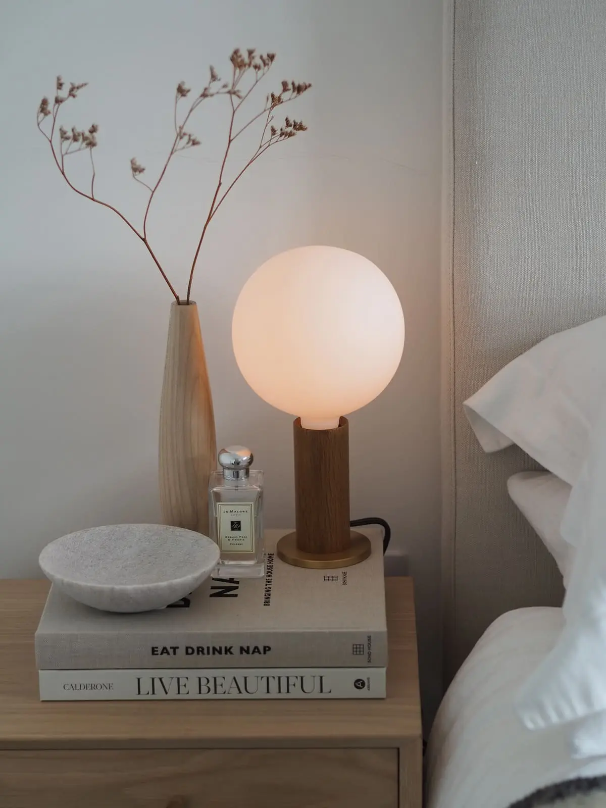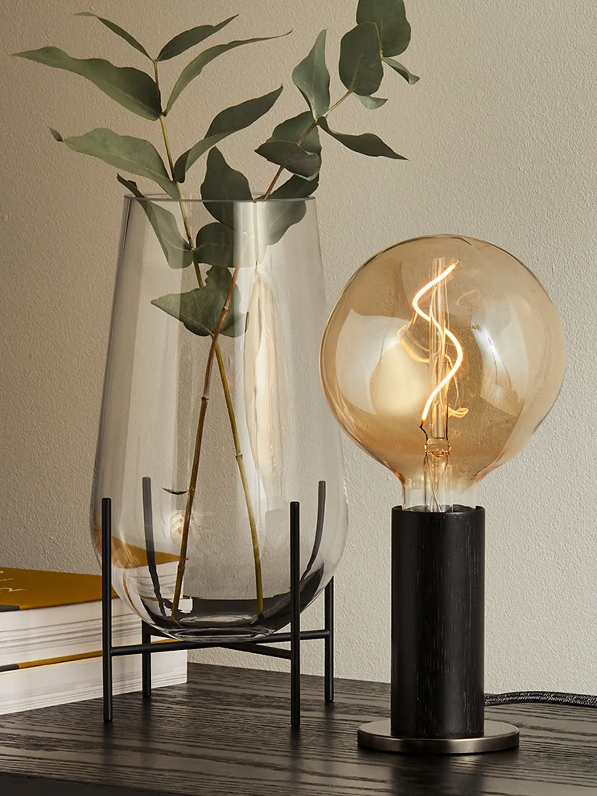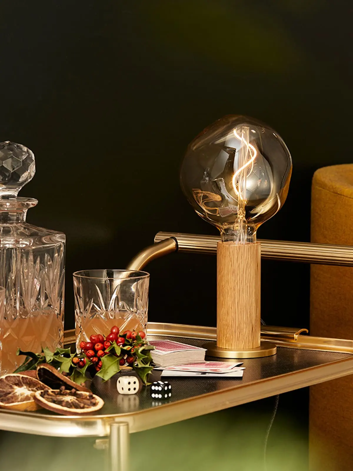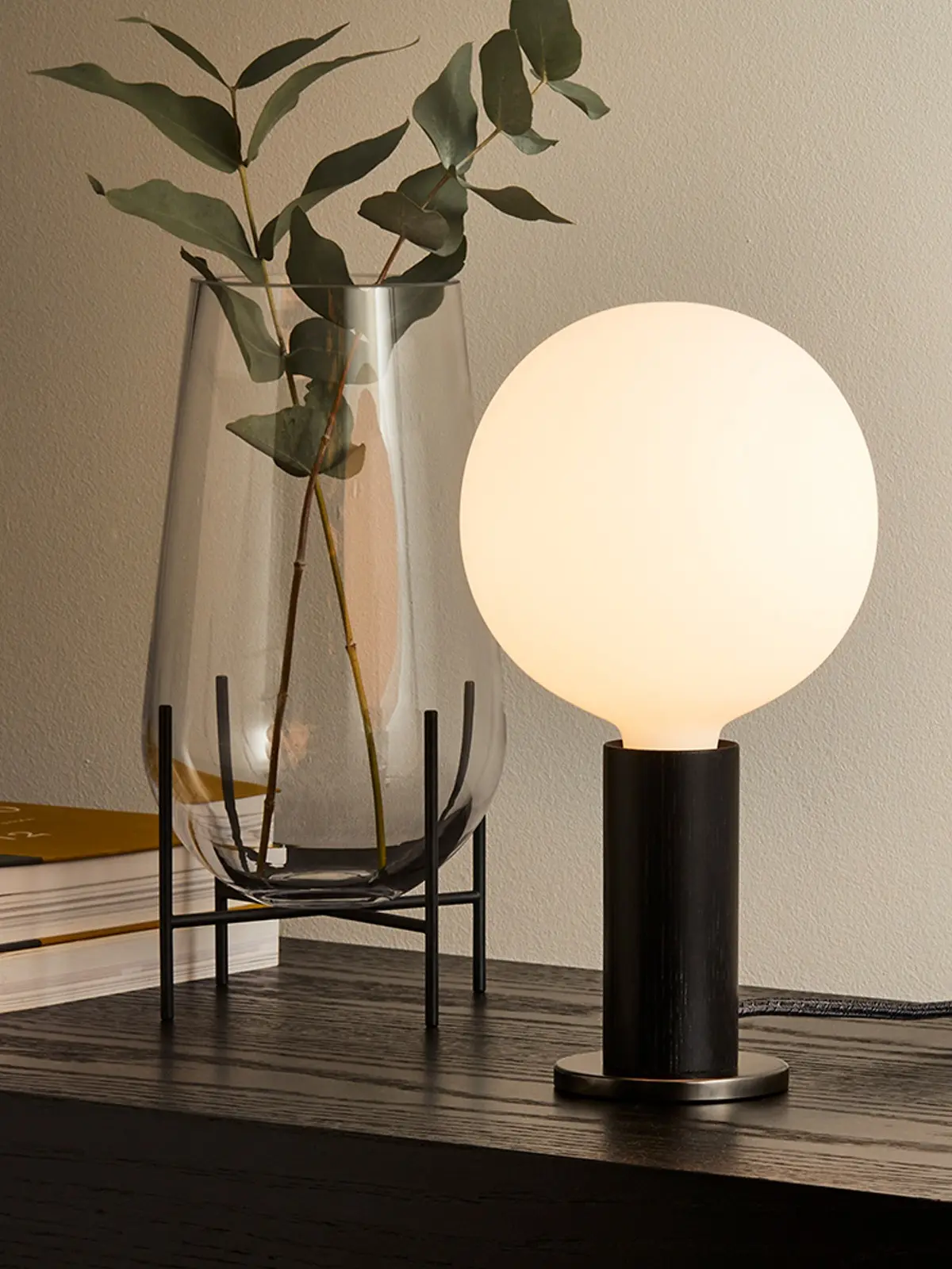 Basis dieses minimalen Designs ist zunächst FSC-zertifiziertes Holz. Hierfür kann man zwischen heller Eiche und dunkler Walnuss wählen. Der schlanke, handgedrehte Zylinder sitzt auf einer Platte aus Messing. Dieser kleine Fuß verleiht der Leuchte ihre Standfestigkeit. Dieses schliche Design ist zeitlos und präsentiert die nackte Glühbirne in ihrer schönsten Form.