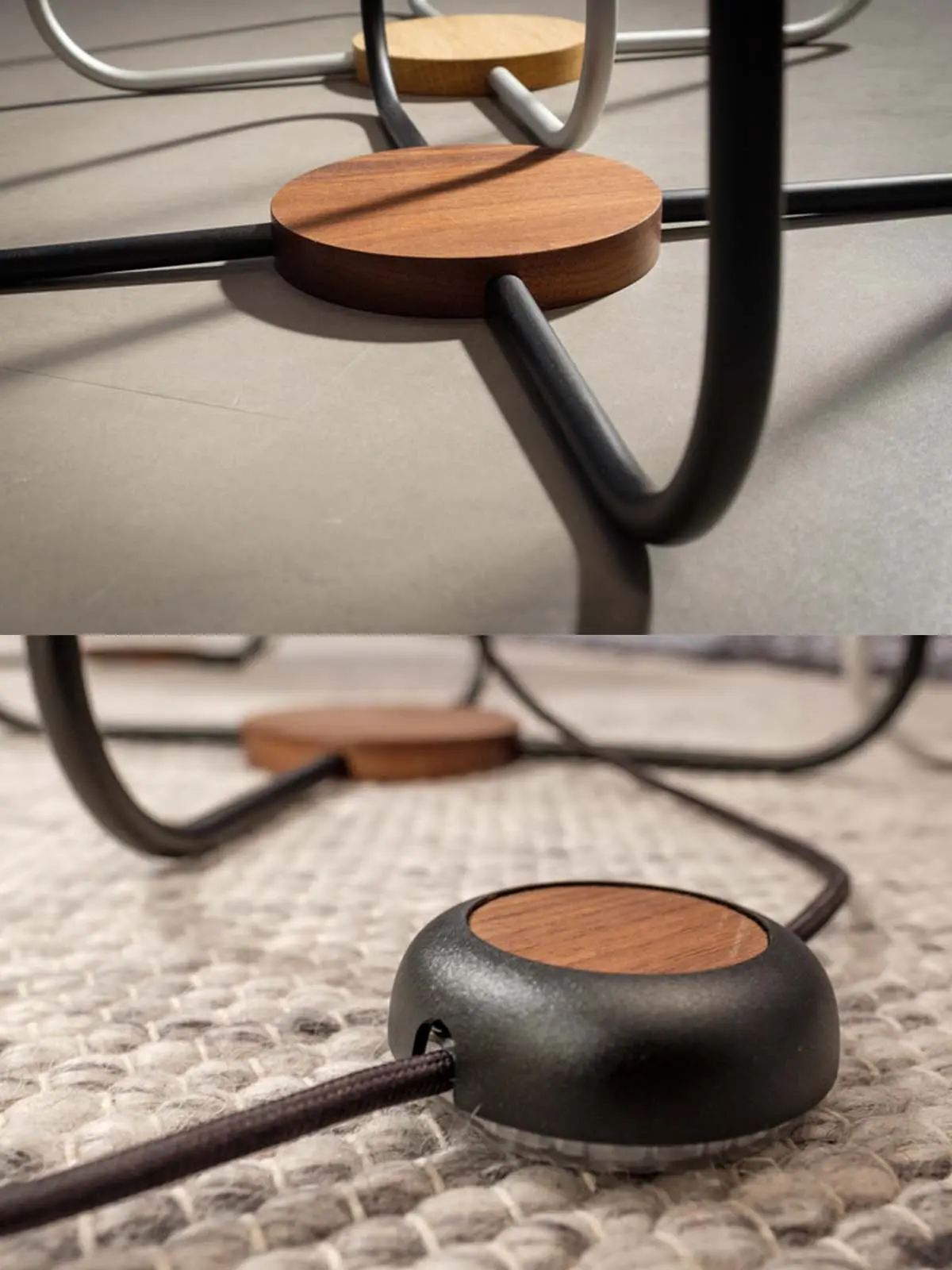 Der Lampenfuß der LIXO besteht aus einem Gestell von gebogenen Rohren aus Metall, die ein wenig an die 50er Jahre erinnern. Mit einer Höhe von 1,40 m ist diese Stehlampe höher als gängige Modelle. Dadurch kann man sie nicht nur in der Ecke des Raumes platzieren, sondern getrost als Leseleuchte neben der Couch nutzten. Und betrachtet man sie von unten, wird erst das hochwertige Design von Domus wirklich deutlich. Denn anstelle einer Fassung aus Plastik wird das Leuchtmittel von massivem Holz getragen. Zudem sorgt ein zusätzlicher Diffusor für blendfreies Licht. Die Farbe des Holzes wird ebenfalls im Fußdimmer wieder aufgegriffen. Diese exklusive Designerlampe entsteht in Handarbeit in Deutschland.