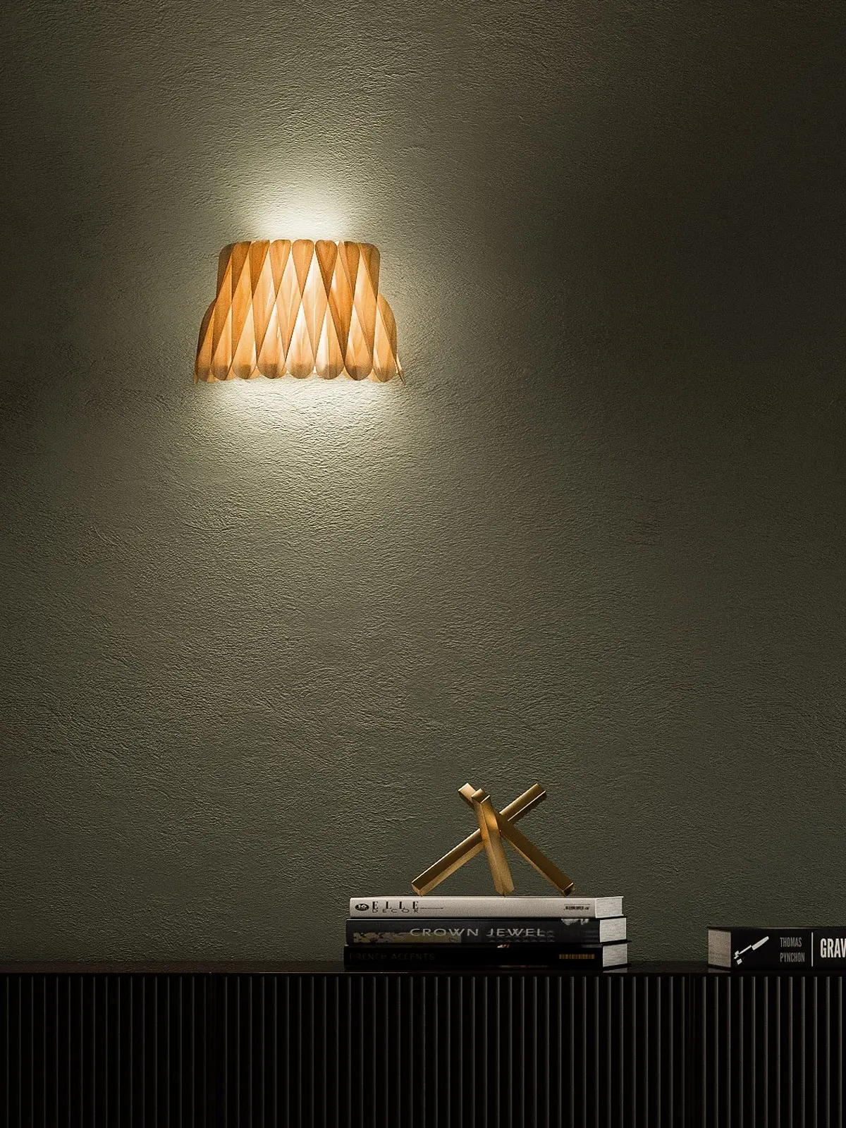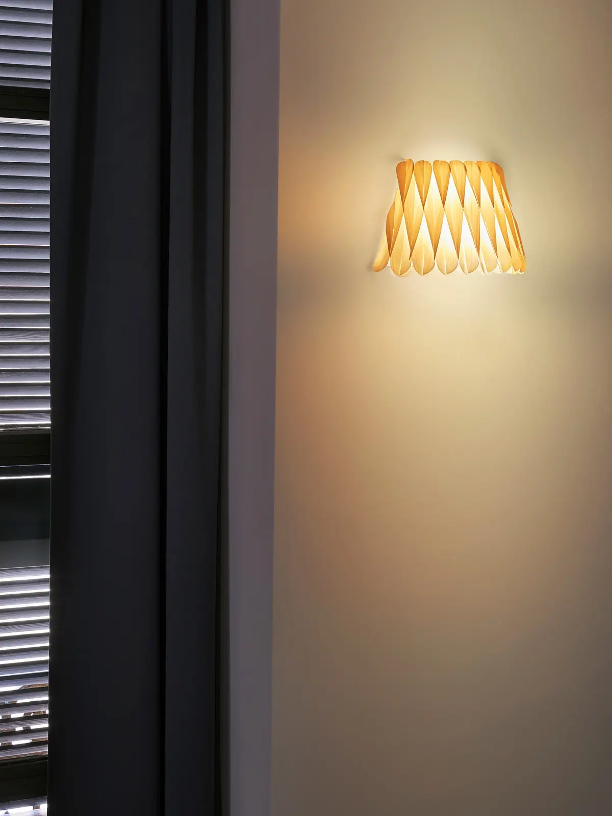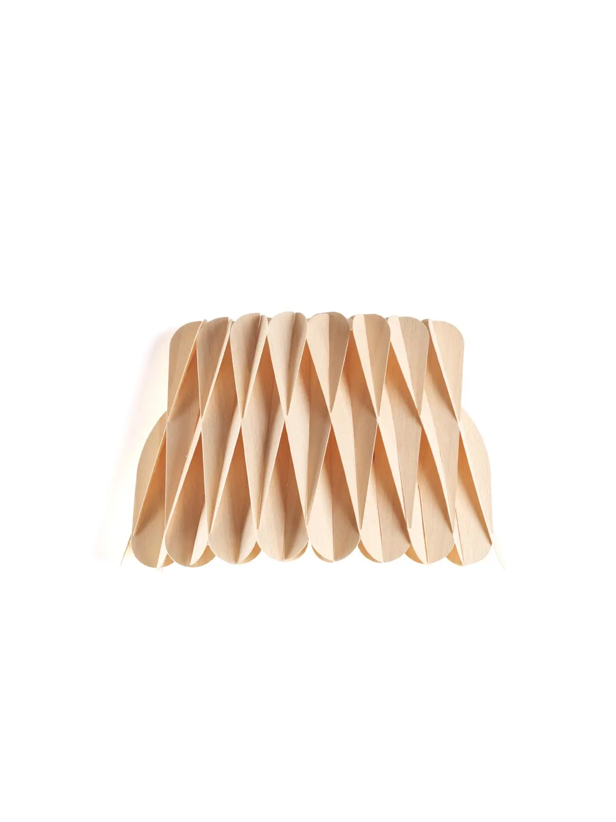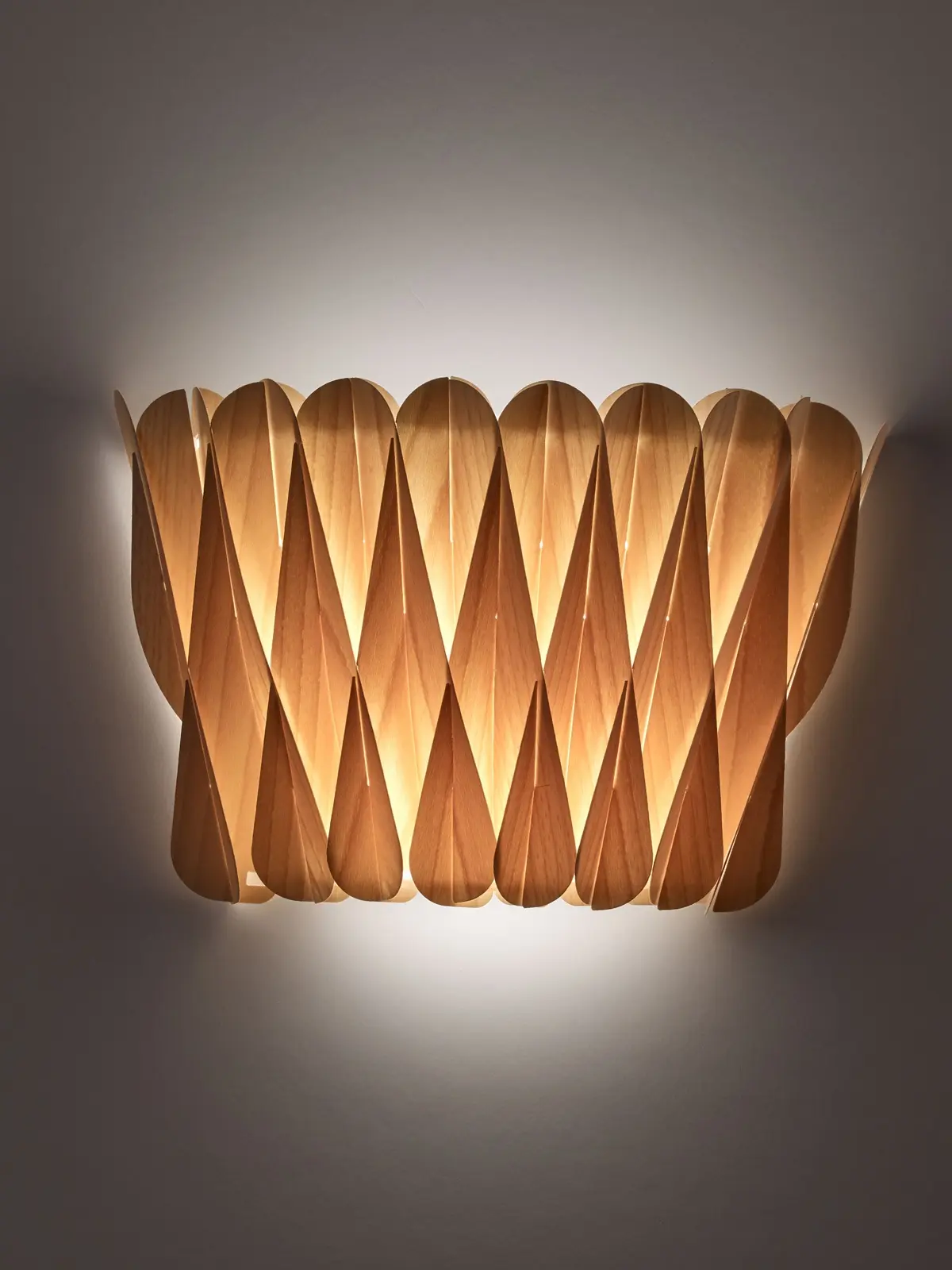 Ray Power ist ein Meister der Geometrie und stellt das bei dieser Lampenfamilie wiederum unter Beweis. Denn Lola S ziert ein kompliziertes Geflecht aus feinem Holzfurnier. Aufgrund dieser Konstruktion entstehen Höhen und Tiefen. Zudem überlappen sich die Elemente aus Holz. Dadurch entsteht nicht nur eine spannende Oberfläche. Denn schaltet man diese Wandlampe ein, entsteht ein faszinierendes Spiel von Licht und Schatten.