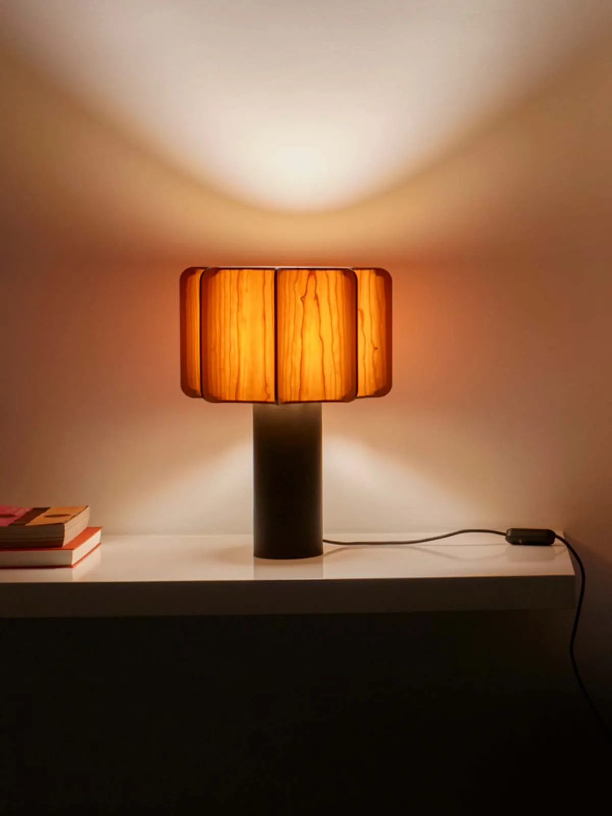 Ein gerader Zylinder aus matter Keramik bildet den eleganten Lampenfuß und sorgt für einen festen Stand. Für den Fuß hat man die Wahl zwischen den Farben Schwarz oder Weiß, was ebenfalls in der Halterung des Lampenschirms farblich aufgegriffen wird. Der Lampenschirm ist aus Blättern von Furnierholz zusammengesetzt, die konkav angeordnet sind. Dadurch wirkt die Form freundlich und dynamisch. In der Tat fand Designer Ray Power die Inspiration für Kactos Table von Kakteen.