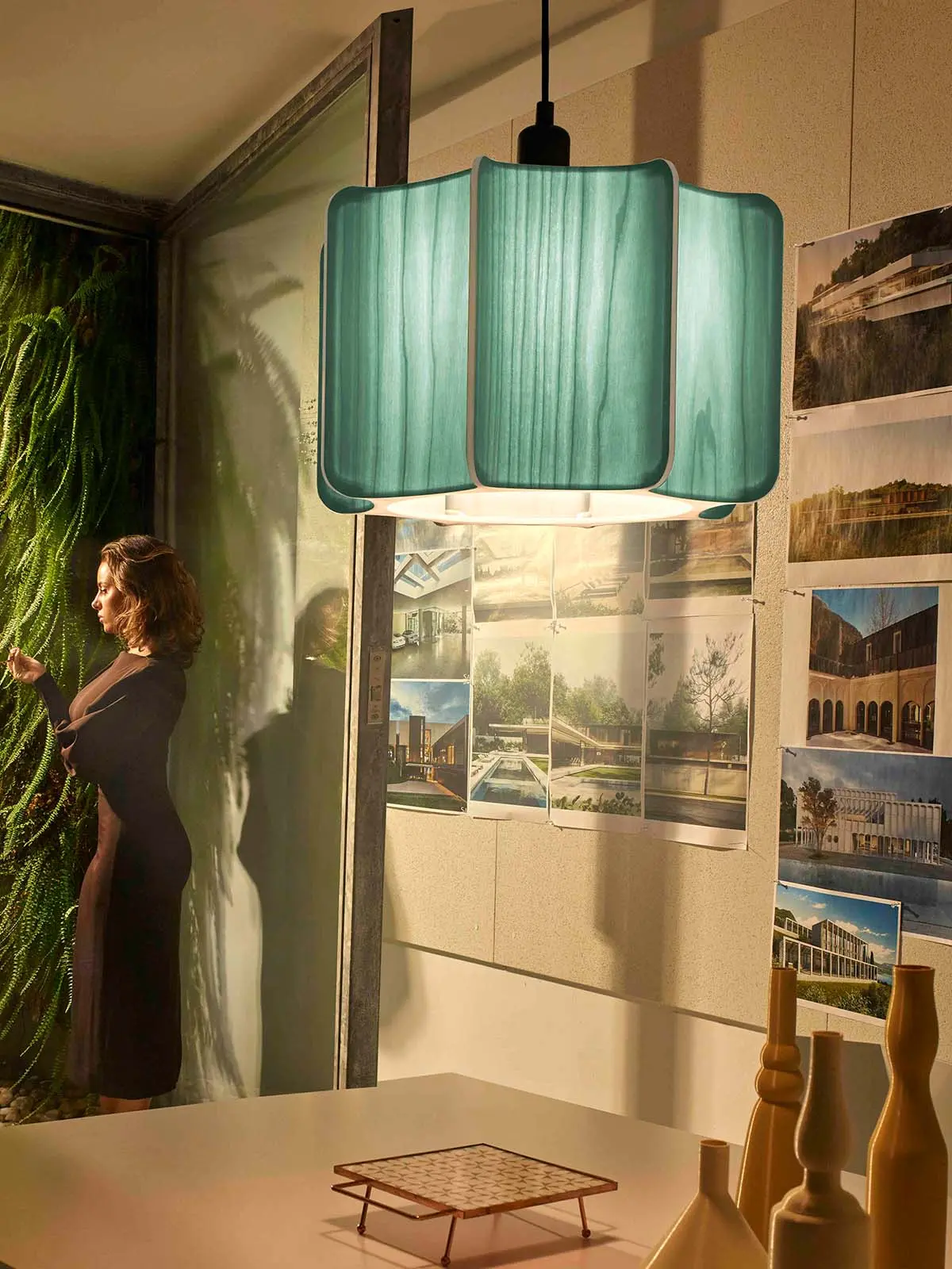 Designerleuchte Kactos ist in 10 Farben Holzfurnier erhältlich. So kann man sie natürlich in Kirsche oder Buche inszenieren, oder knallig in Orange oder Rot. Schaltet man die Hängelampe ein, wird die natürliche Maserung des Holzes betont. Die Pendelleuchte lässt sich mit der passenden Tischleuchte oder den weiteren Leuchten und Lampen von LZF kombinieren.