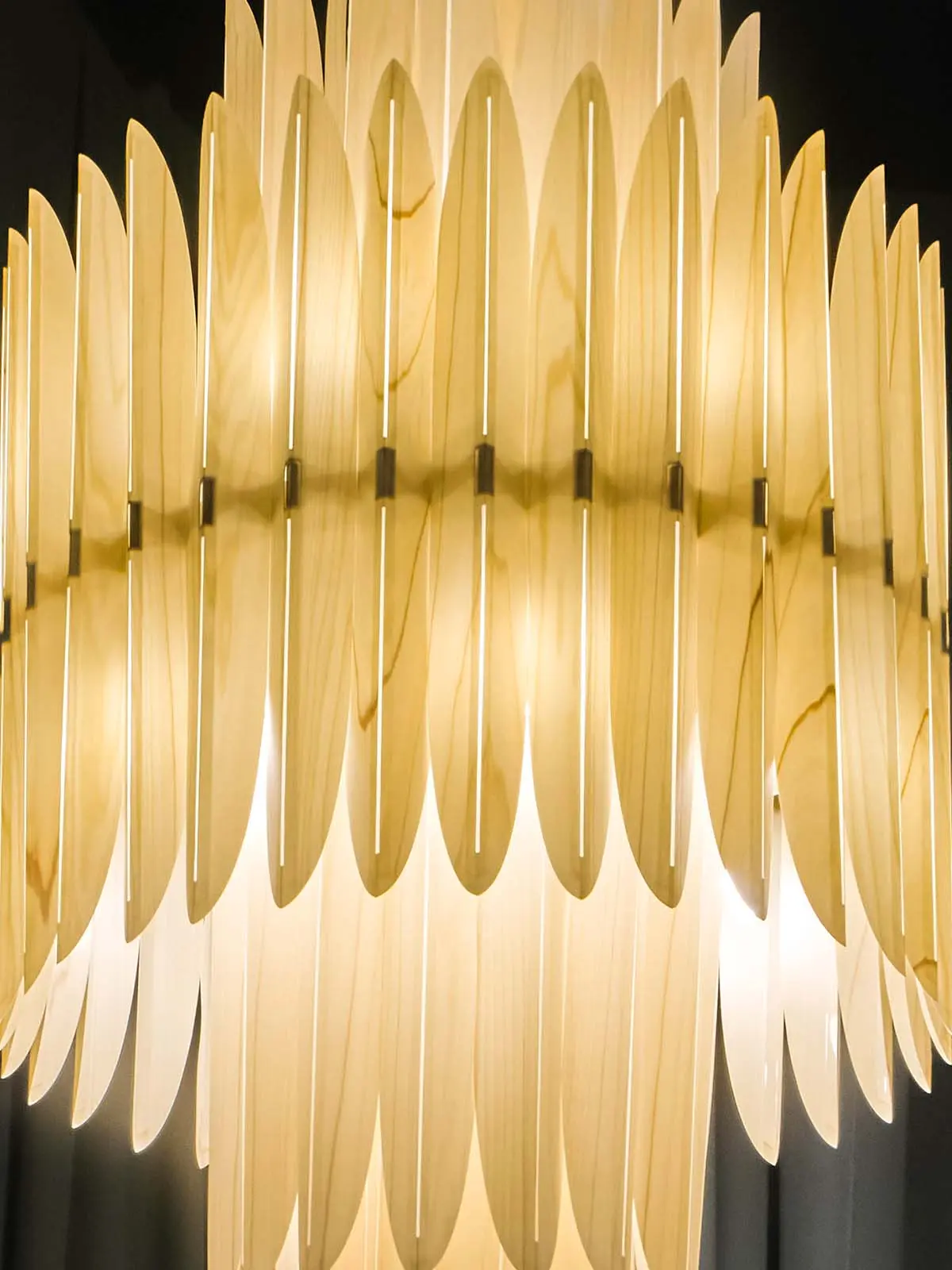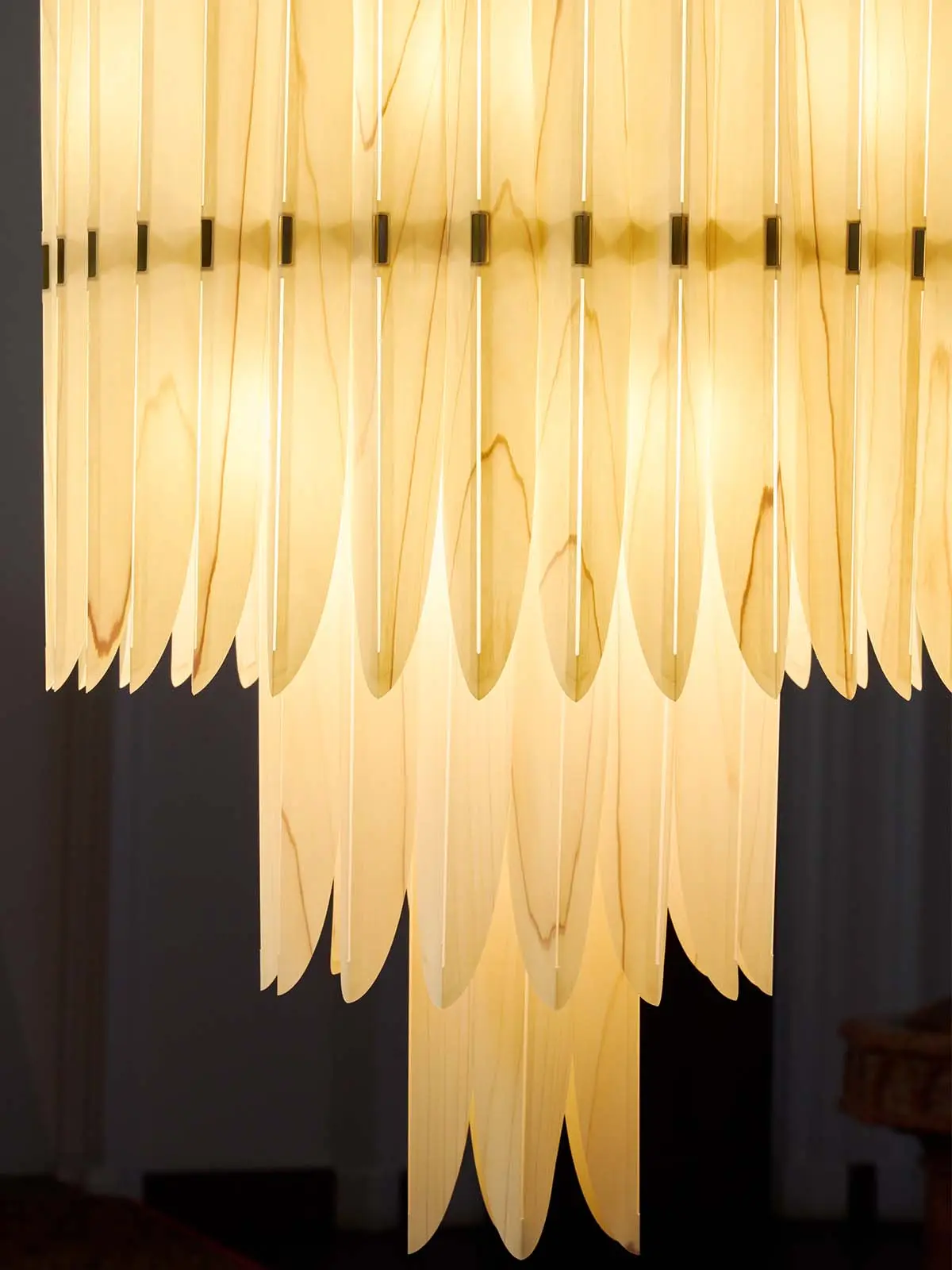 Kronleuchter Voliere ist eine Hommage an das Design der 1920er-Jahre. Die große LZF Furnierholzleuchte ist eine Neuinterpretation von eleganten Lüstern des Jugendstils.