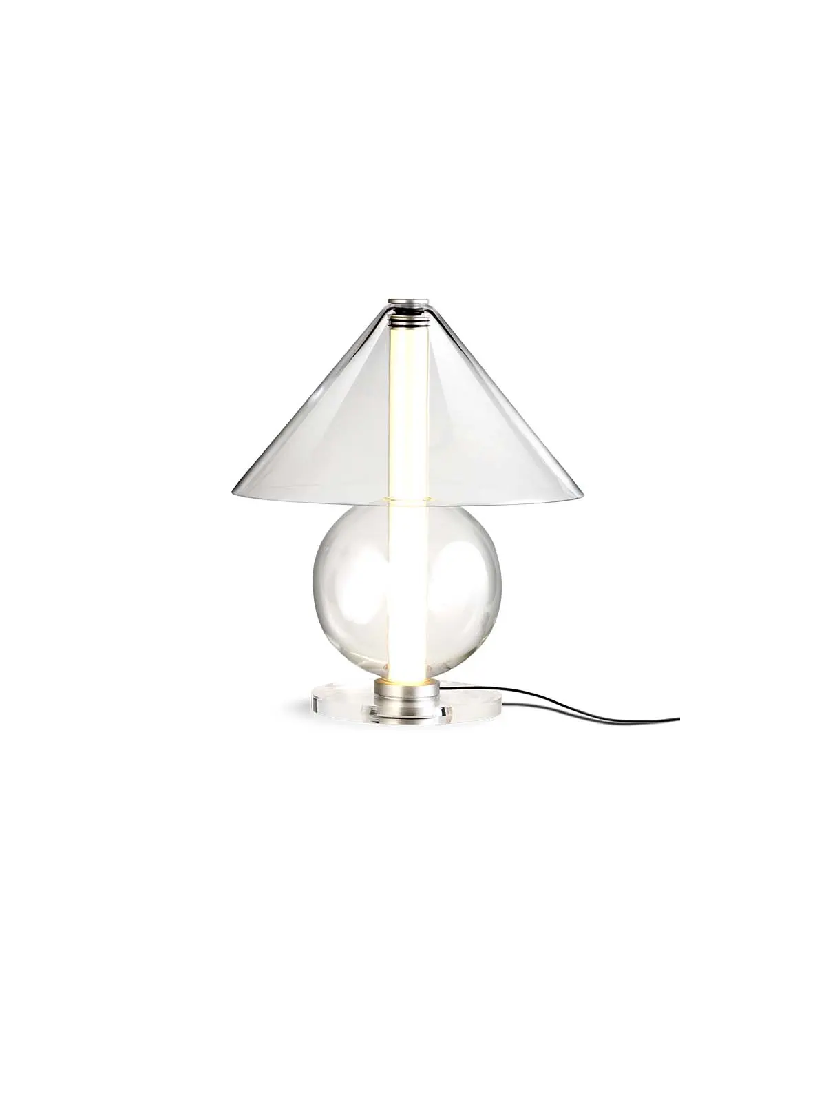 Der spanische Designer Jaume Ramírez nahm den klassischen konischen Lampenschirm als Ausgangspunkt seines Entwurfes. Für den mittleren Teil der Fragile Designerleuchte wählte er eine Kugel. Eine flache Basis bildet schließlich den Lampenfuß und sorgt für einen festen Stand. Als Leuchtmittel dient ein senkrechter Zylinder, der alle Elemente verbindet. Das Licht scheint von unten nach oben und dringt zu allen Seiten in den Raum.