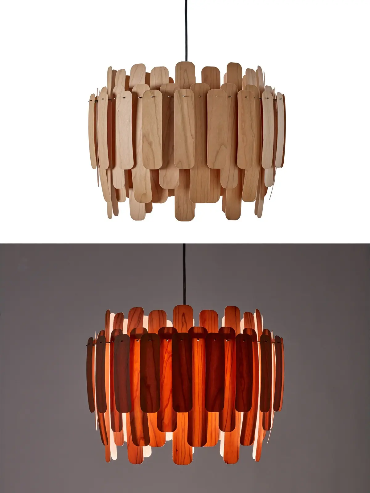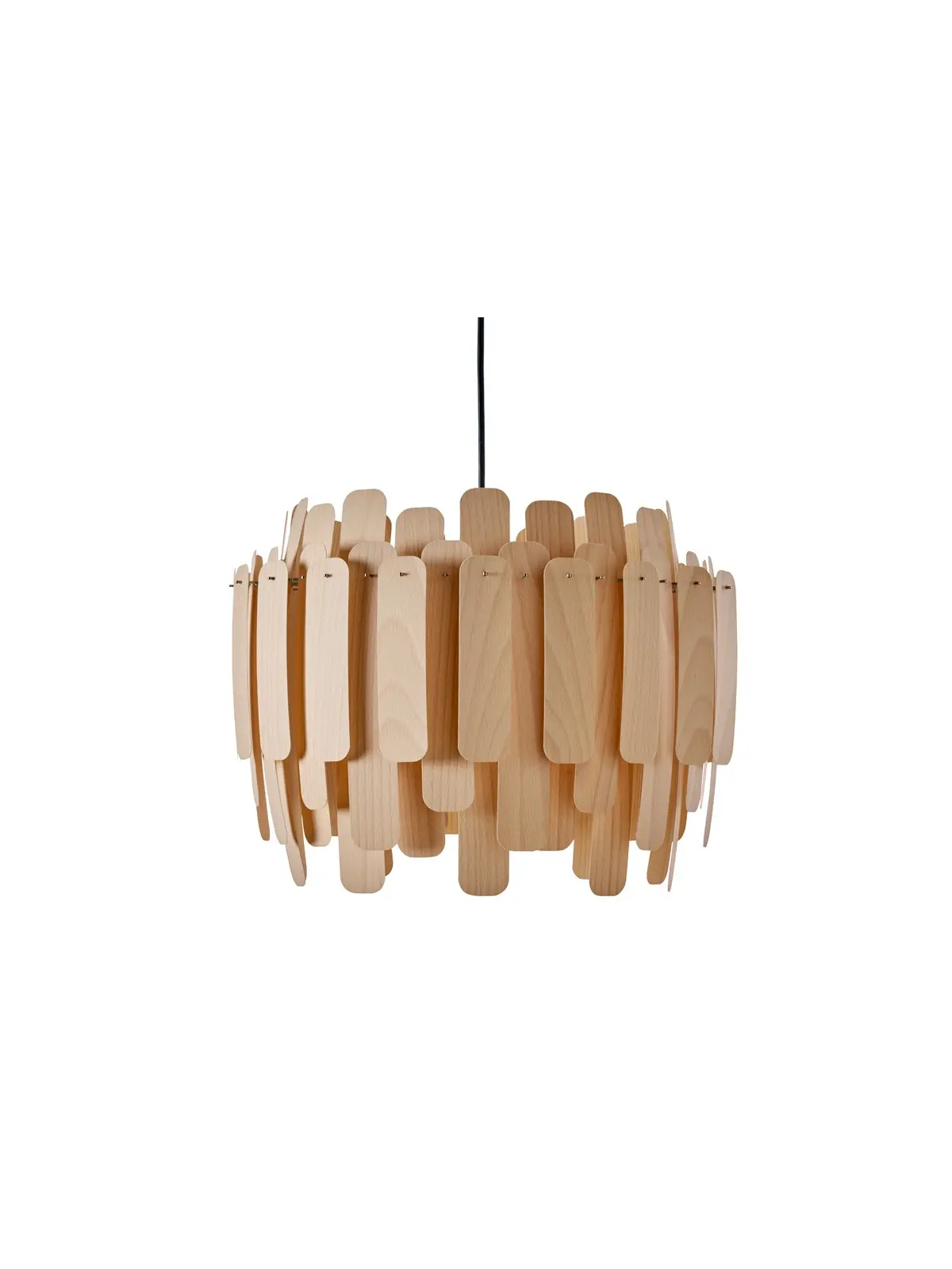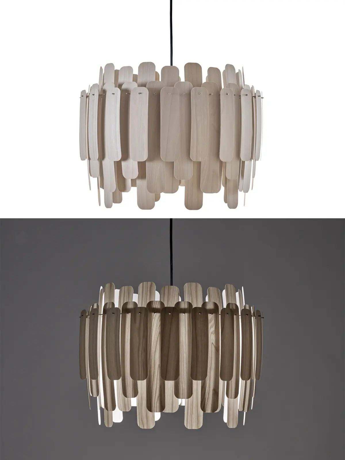 Die LZF Maruja Leuchte basiert auf einem runden Rahmen. Feine Streifen Furnierholz in unterschiedlichen Größen werden dann mithilfe kleiner Pins angebracht. So entsteht der trommelförmige Lampenschirm. Im eingeschalteten Zustand betont das Licht dann das Holzfurnier auf faszinierende Weise.