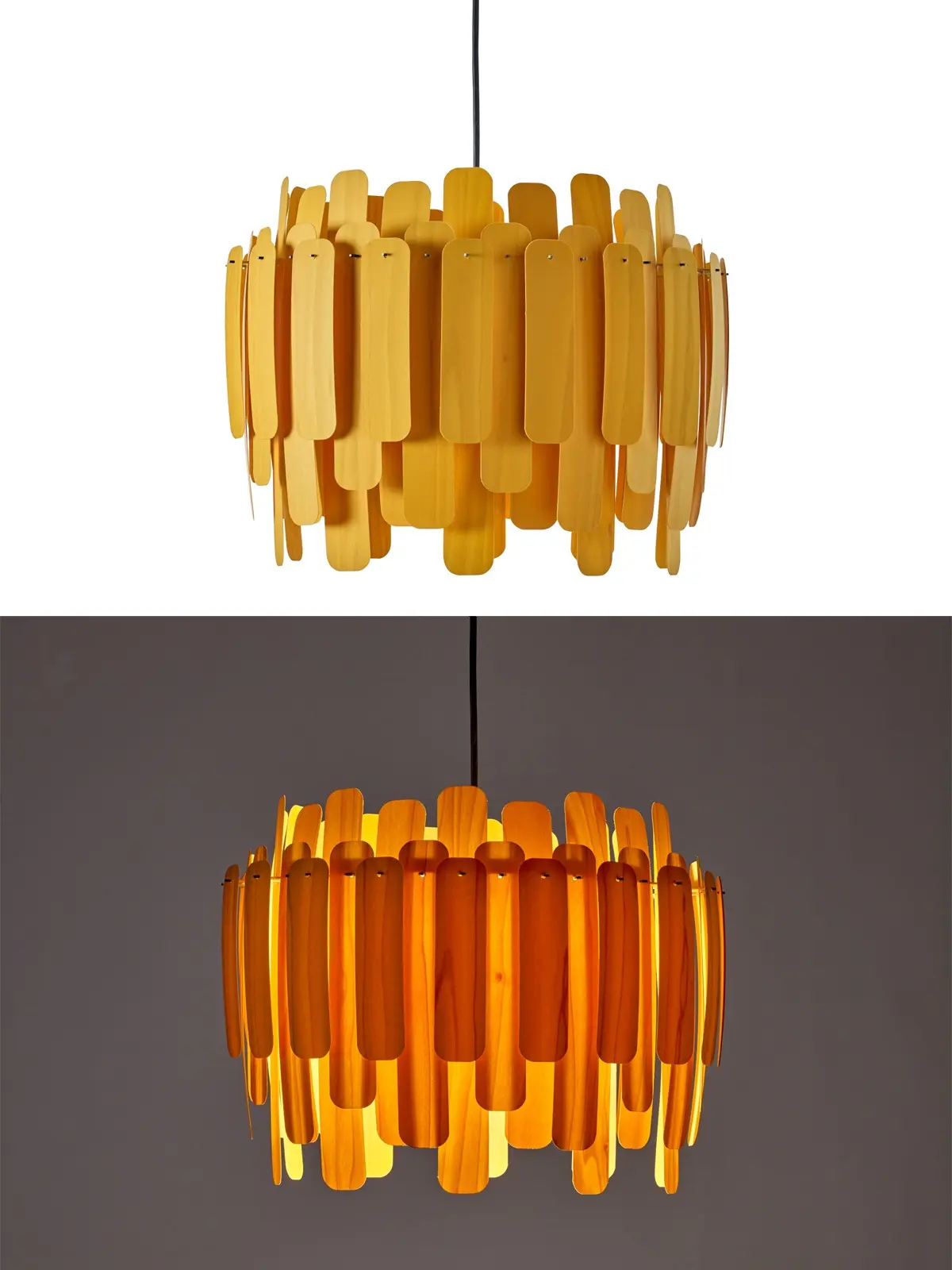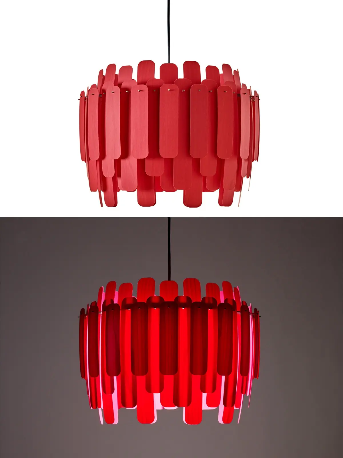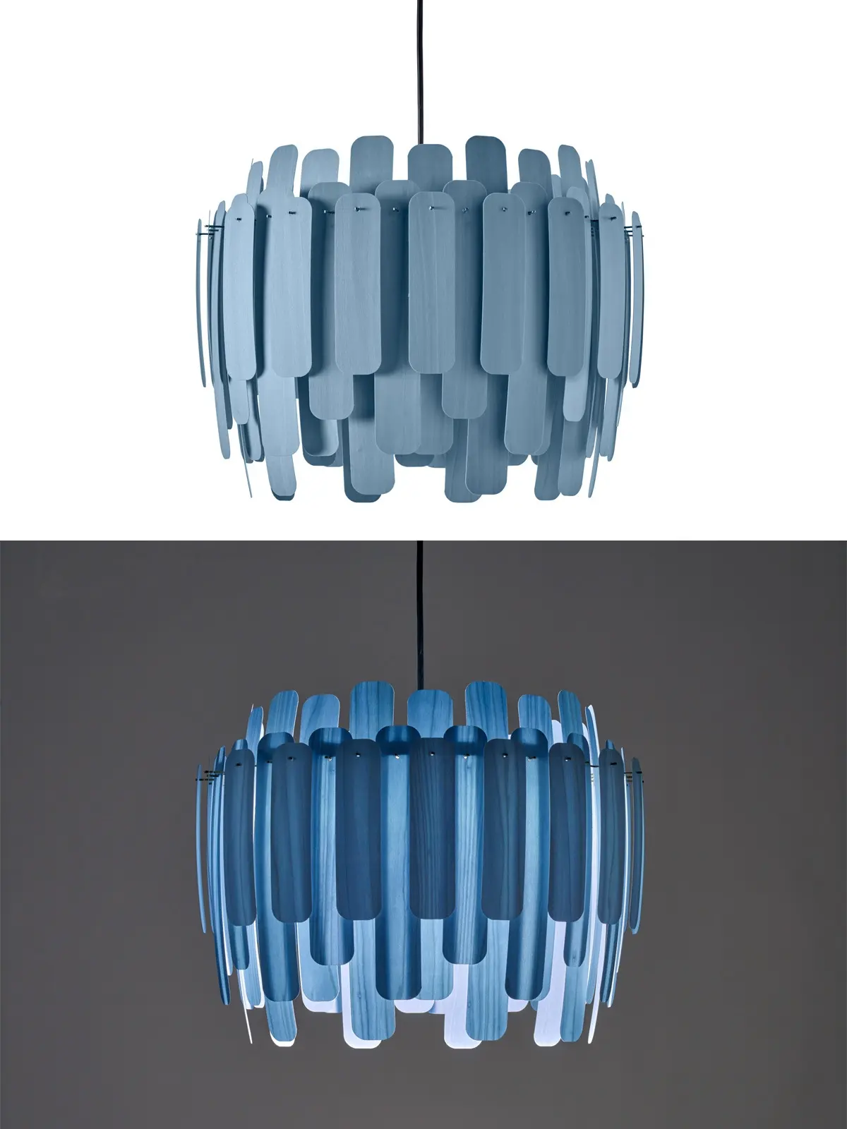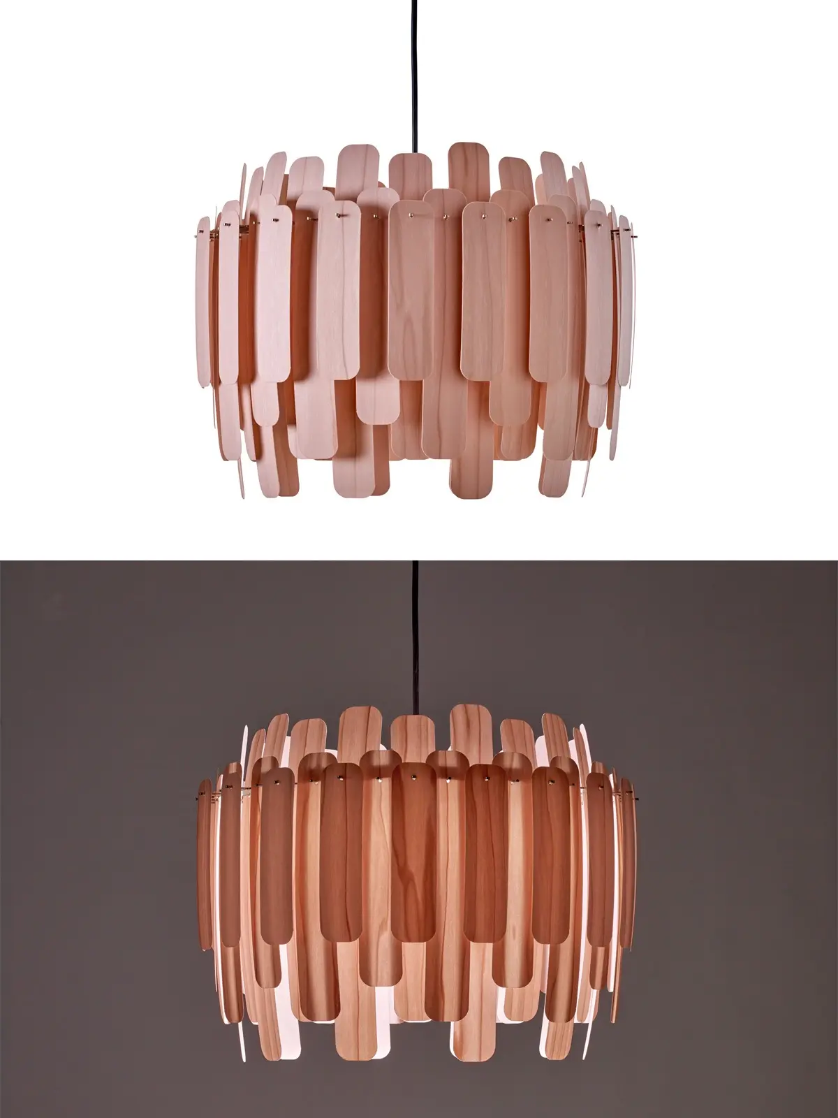 Die LZF Maruja Leuchte basiert auf einem runden Rahmen. Feine Streifen Furnierholz in unterschiedlichen Größen werden dann mithilfe kleiner Pins angebracht. So entsteht der trommelförmige Lampenschirm. Im eingeschalteten Zustand betont das Licht dann das Holzfurnier auf faszinierende Weise.