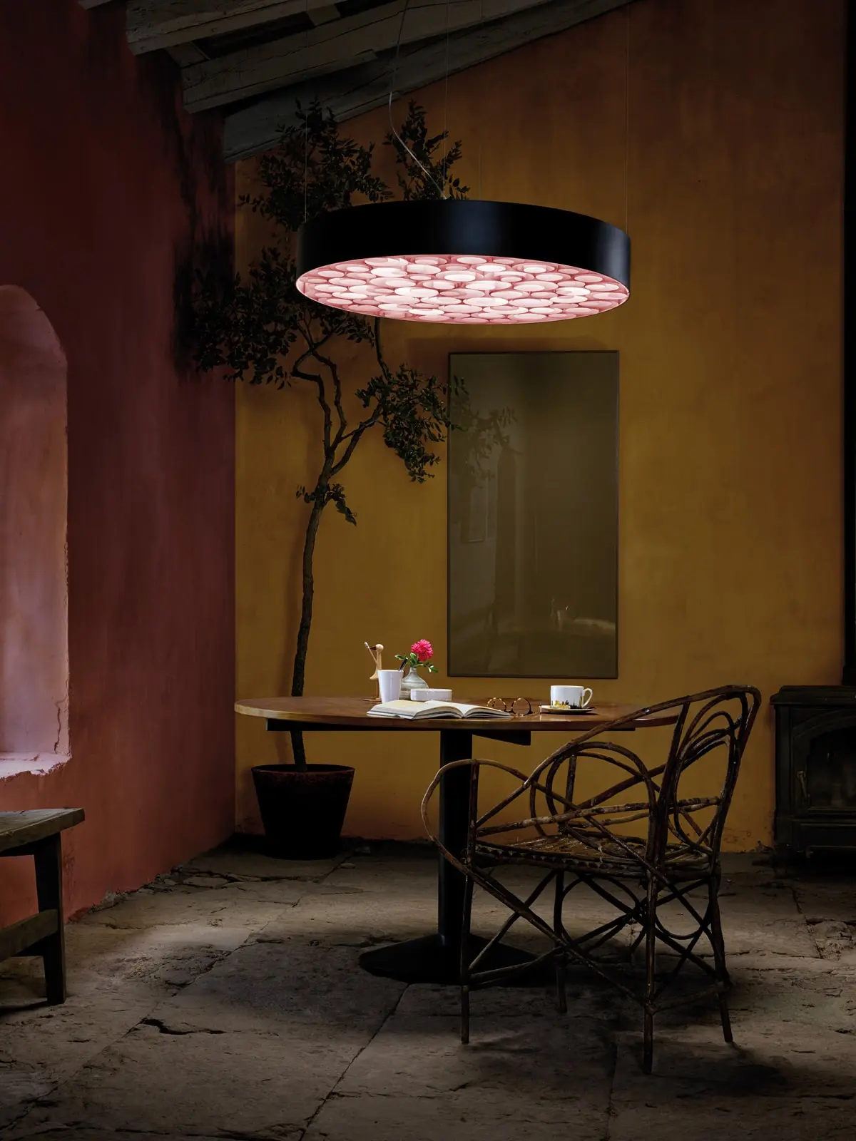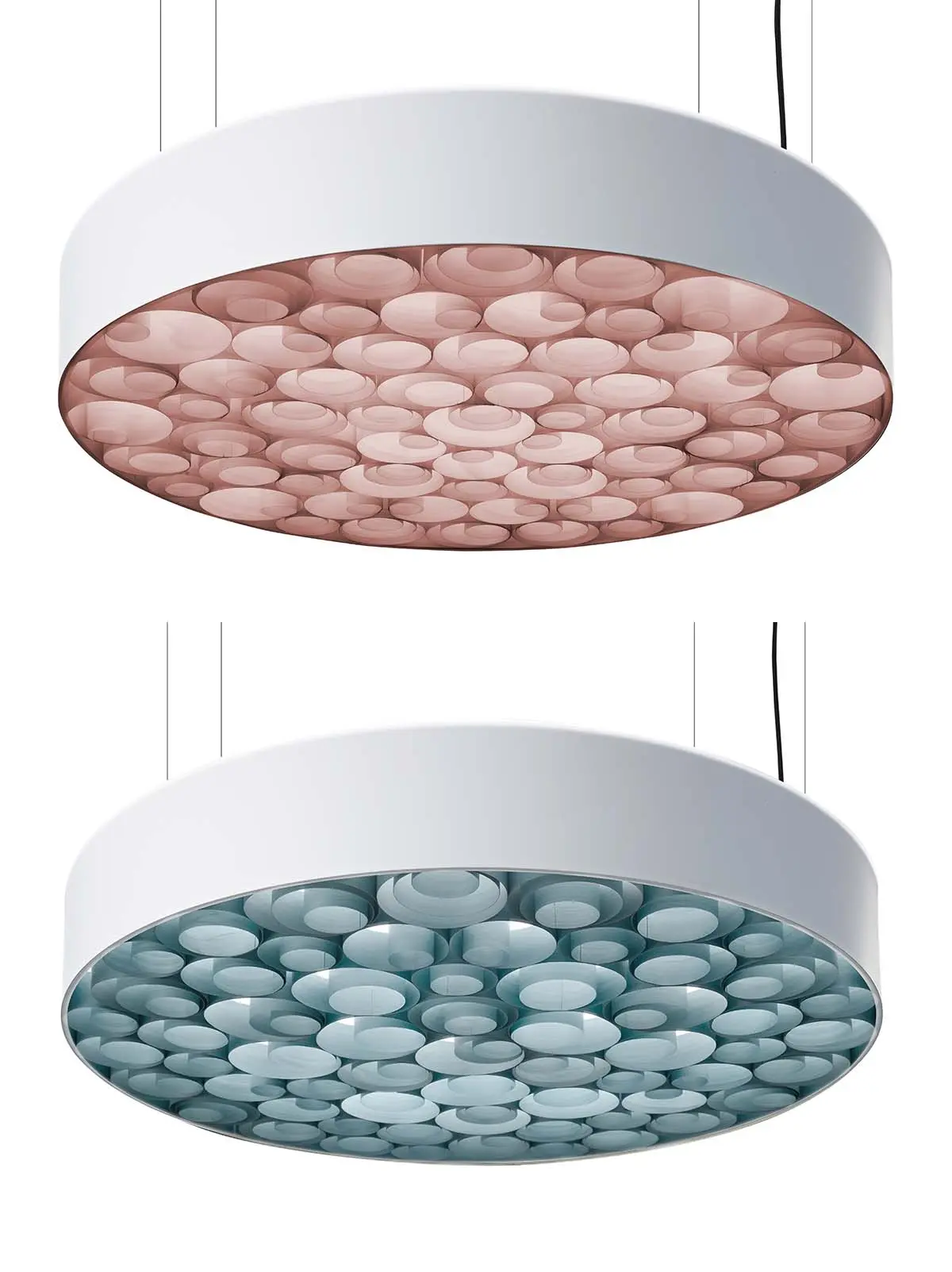 Spiro Black kommt mit einem kreisrunden, schwarzen Rahmen aus Acryl. Dieser legt sich wie ein ruhendes Band um das effektvolle Innenleben der Leuchte. Für die Farbe der innenliegenden, kreisförmigen Furnierholzstreifen kann man aus 10 Tönen wählen und damit die Wirkung, welche durch die Leuchte erzeugt wird, maßgeblich mitbestimmt werden. Das abgegebene Licht wird nach unten durch einen matt, satinierten Diffusor gleichmäßig verteilt, nach oben dringt es subtil durch einen weißen Diffusor. Aufgrund ihrer durchdachten Konstruktion wird der Raum sowohl mit direktem als auch indirektem Licht erhellt.